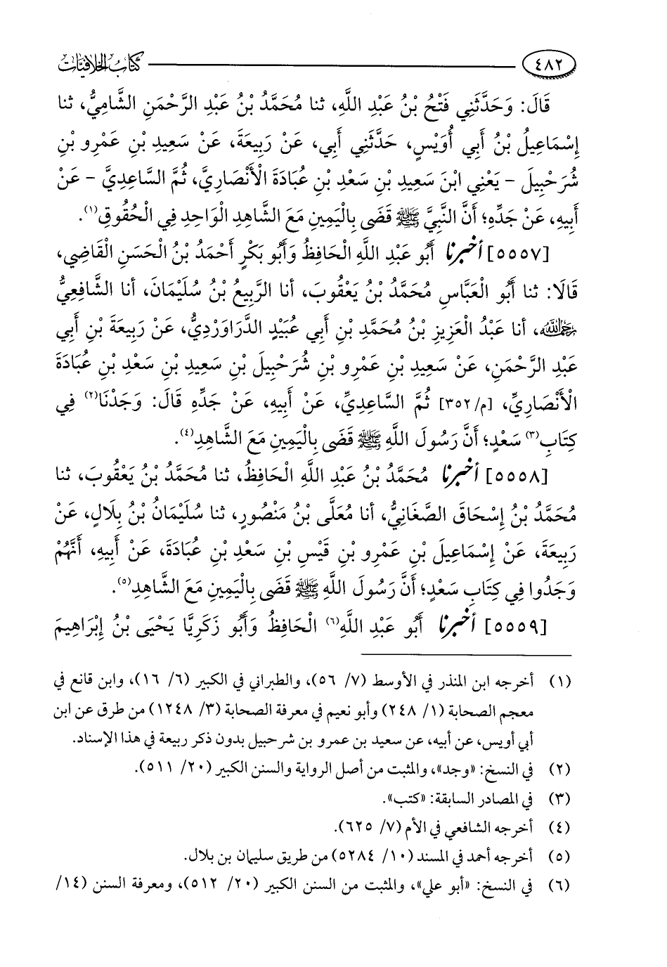 [5557] أخبرنا أَبُو عَبْدِ اللَّهِ الْحَافِظُ وَأَبُو بَكْرٍ أَحْمَدُ بْنُ الْحَسَنِ الْقَاضِي، قَالَا: ثنا أَبُو الْعَبَّاسِ مُحَمَّدُ بْنُ يَعْقُوبَ، أنا الرَّبِيعُ بْنُ سُلَيْمَانَ، أنا الشَّافِعِيُّ - رحمه الله -، أنا عَبْدُ الْعَزِيزِ بْنُ مُحَمَّدِ بْنِ أَبِي عُبَيْدٍ الدَّرَاوَرْدِيُّ، عَنْ رَبِيعَةَ بْنِ أَبِي عَبْدِ الرَّحْمَنِ، عَنْ سَعِيدِ بْنِ عَمْرِو بْنِ شُرَحْبِيلَ بْنِ سَعِيدِ بْنِ سَعْدِ بْنِ عُبَادَةَ الْأَنْصَارِيِّ، ثُمَّ السَّاعِدِيِّ، عَنْ أَبِيهِ، عَنْ جَدِّهِ قَالَ: وَجَدْنَا (¬2) فِي كِتَابِ (¬3) سَعْدٍ؛ أَنَّ رَسُولَ اللَّهِ - صلى الله عليه وسلم - قَضَى بِالْيَمِينِ مَعَ الشَّاهِدِ (¬4).