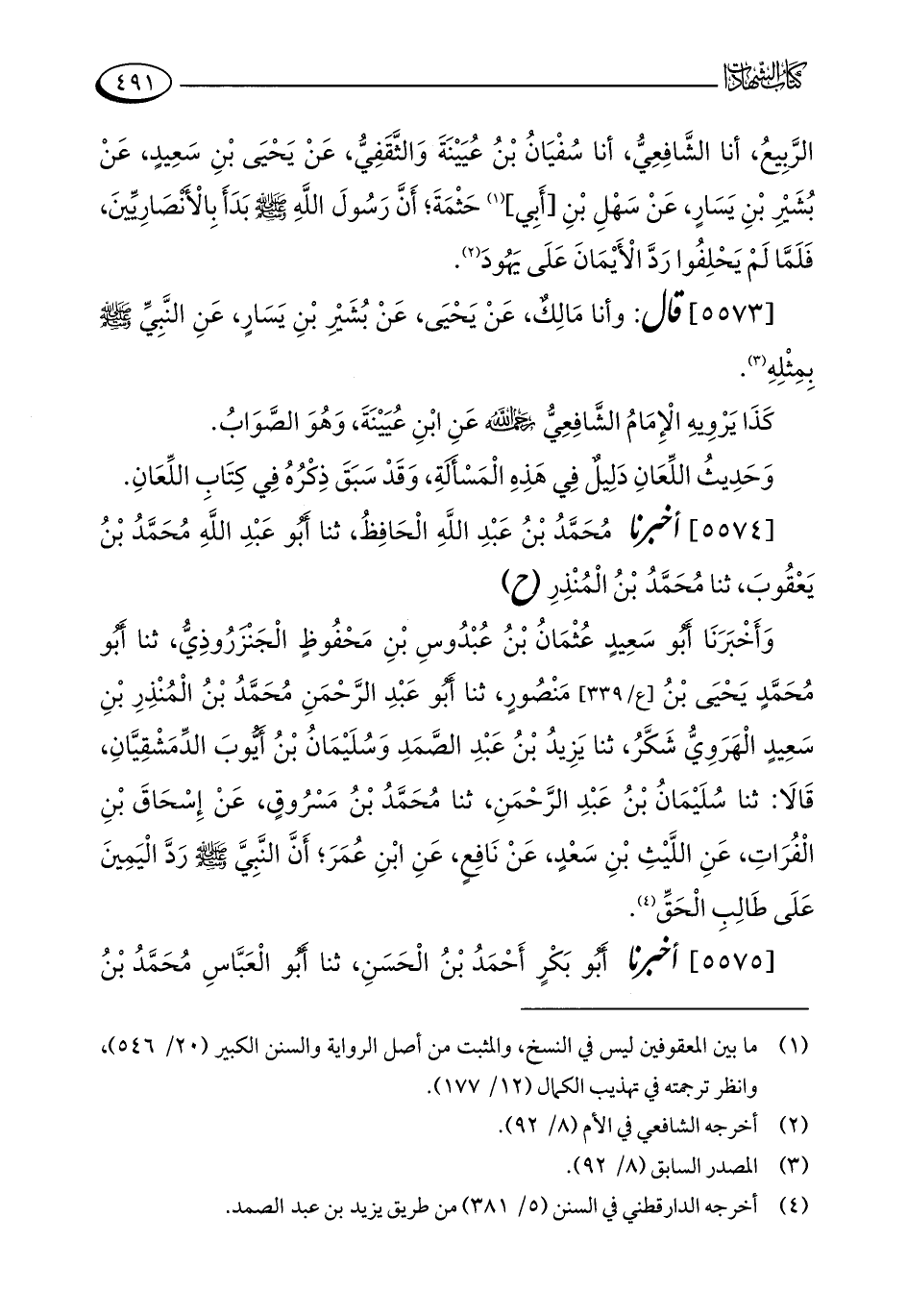 الرَّبِيعُ، أنا الشَّافِعِيُّ، أنا سُفْيَانُ بْنُ عُيَيْنَةَ وَالثَّقَفِيُّ، عَنْ يَحْيَى بْنِ سَعِيدٍ، عَنْ بُشَيْرِ بْنِ يَسَارٍ، عَنْ سَهْلِ بْنِ [أَبِي] (¬1) حَثْمَةَ؛ أَنَّ رَسُولَ اللَّهِ - صلى الله عليه وسلم - بَدَأَ بِالْأَنْصَارِيِّينَ، فَلَمَّا لَمْ يَحْلِفُوا رَدَّ الْأَيْمَانَ عَلَى يَهُودَ (¬2).