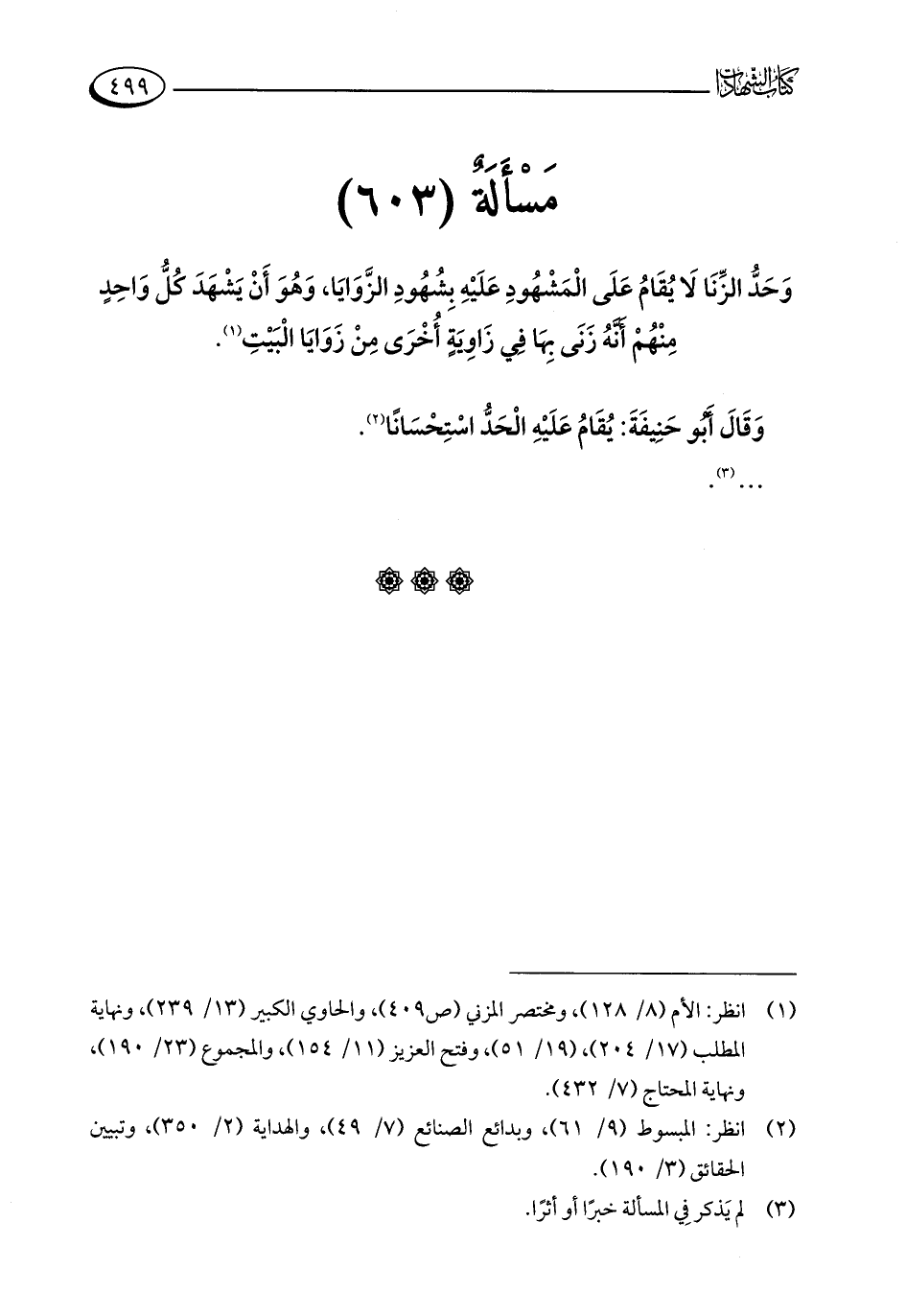 مَسْأَلَةٌ (603): وَحَدُّ الزِّنَا لَا يُقَامُ عَلَى الْمَشْهُودِ عَلَيْهِ بِشُهُودِ الزَّوَايَا، وَهُوَ أَنْ يَشْهَدَ كُلُّ وَاحِدٍ مِنْهُمْ أَنَّهُ زَنَى بِهَا فِي زَاوِيَةٍ أُخْرَى مِنْ زَوَايَا الْبَيْتِ (¬1).