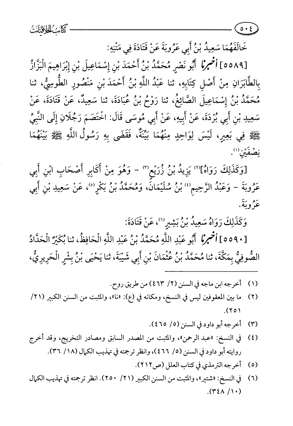 [5589] أخبرنا أَبُو نَصْرٍ مُحَمَّدُ بْنُ أَحْمَدَ بْنِ إِسْمَاعِيلَ بْنِ إِبْرَاهِيمَ الْبَزَّازُ بِالطَّابَرَانِ مِنْ أَصْلِ كِتَابِهِ، ثنا عَبْدُ اللَّهِ بْنُ أَحْمَدَ بْنِ مَنْصُورٍ الطُّوسِيُّ، ثنا مُحَمَّدُ بْنُ إِسْمَاعِيلَ الصَّائِغُ، ثنا رَوْحُ بْنُ عُبَادَةَ، ثنا سَعِيدٌ، عَنْ قَتَادَةَ، عَنْ سَعِيدِ بْنِ أَبِي بُرْدَةَ، عَنْ أَبِيهِ، عَنْ أَبِي مُوسَى قَالَ: اخْتَصَمَ رَجُلَانِ إِلَى النَّبِيِّ - صلى الله عليه وسلم - فِي بَعِيرٍ، لَيْسَ لِوَاحِدٍ مِنْهُمَا بَيِّنَةٌ، فَقَضَى بِهِ رَسُولُ اللَّهِ - صلى الله عليه وسلم - بَيْنَهُمَا نِصْفَيْنِ (¬1).