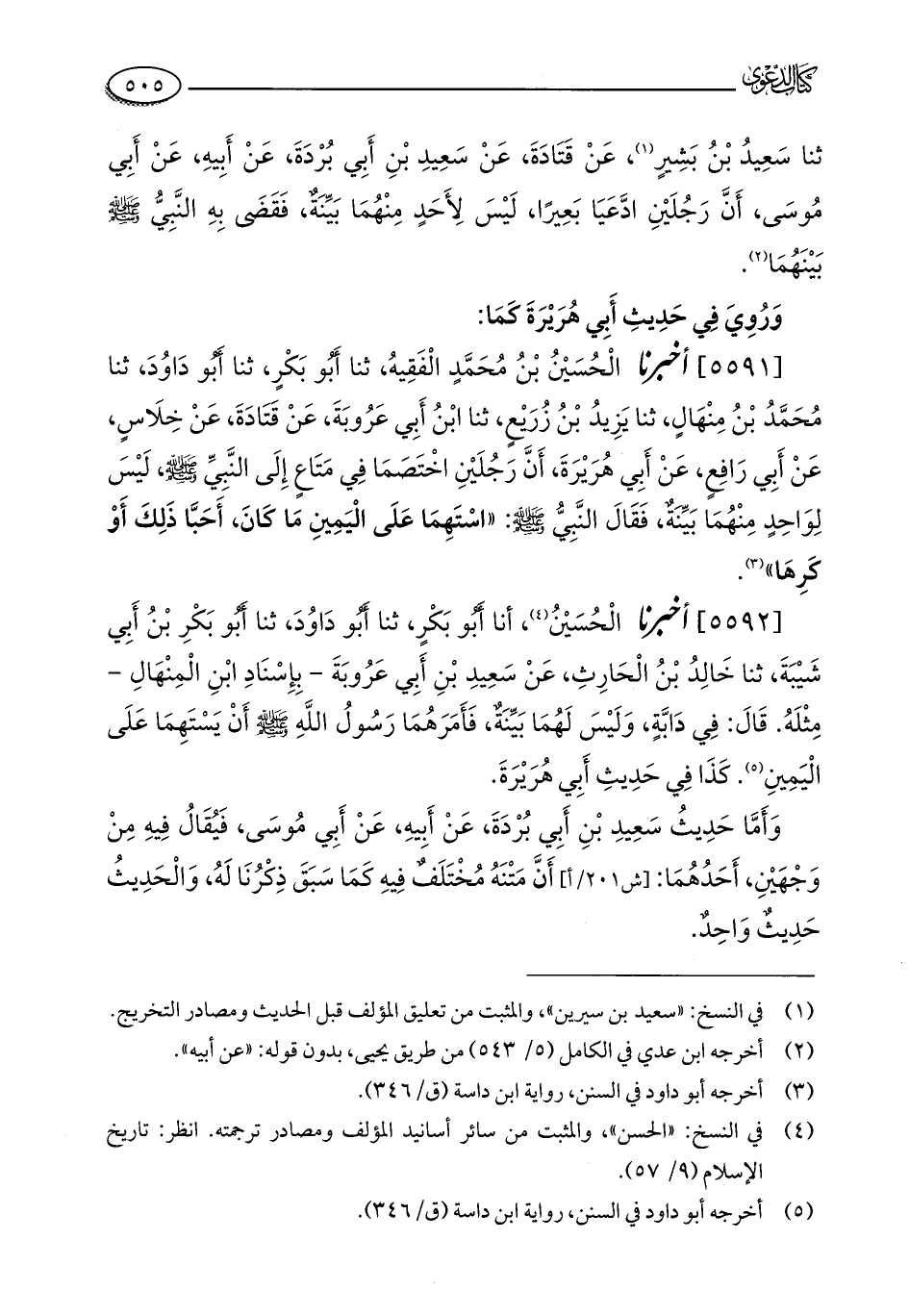 [5592] أخبرنا الْحُسَيْنُ (¬4)، أنا أَبُو بَكْرٍ، ثنا أَبُو دَاوُدَ، ثنا أَبُو بَكْرِ بْنُ أَبِي شَيْبَةَ، ثنا خَالِدُ بْنُ الْحَارِثِ، عَنْ سَعِيدِ بْنِ أَبِي عَرُوبَةَ - بِإِسْنَادِ ابْنِ الْمِنْهَالِ - مِثْلَهُ. قَالَ: فِي دَابَّةٍ، وَلَيْسَ لَهُمَا بَيِّنَةٌ، فَأَمَرَهُمَا رَسُولُ اللَّهِ - صلى الله عليه وسلم - أَنْ يَسْتَهِمَا عَلَى الْيَمِينِ (¬5). كَذَا فِي حَدِيثِ أَبِي هُرَيْرَةَ.
