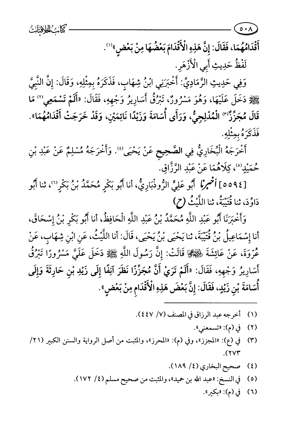 وَفِي حَدِيثِ الرَّمَادِيِّ: أَخْبَرَنِي ابْنُ شِهَابٍ، فَذَكَرَهُ بِمِثْلِهِ، وَقَالَ: إِنَّ النَّبِيَّ - صلى الله عليه وسلم - دَخَلَ عَلَيْهَا، وَهُوَ مَسْرُورٌ، تَبْرُقُ أَسَارِيرُ وَجْهِهِ، فَقَالَ: "أَلَمْ تَسْمَعِي (¬2) مَا قَالَ مُجَزِّزٌ (¬3) الْمُدْلِجِيُّ، وَرَأَى أُسَامَةَ وَزَيْدًا نَائِمَيْنِ، وَقَدْ خَرَجَتْ أَقْدَامُهُمَا". فَذَكَرَهُ بِمِثْلِهِ.