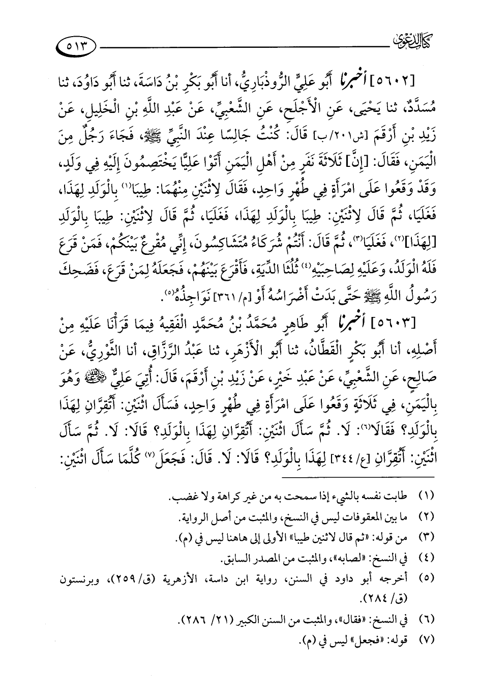 [5602] أخبرنا أَبُو عَلِيٍّ الرُّوذْبَارِيُّ، أنا أَبُو بَكْرِ بْنُ دَاسَةَ، ثنا أَبُو دَاوُدَ، ثنا مُسَدَّدٌ، ثنا يَحْيَى، عَنِ الْأَجْلَحِ، عَنِ الشَّعْبِيِّ، عَنْ عَبْدِ اللَّهِ بْنِ الْخَلِيلِ، عَنْ زَيْدِ بْنِ أَرْقَمَ قَالَ: كُنْتُ جَالِسًا عِنْدَ النَّبِيِّ - صلى الله عليه وسلم -، فَجَاءَ رَجُلٌ مِنَ الْيَمَنِ، فَقَالَ: [إِنَّ] ثَلَاثَةَ نَفَرٍ مِنْ أَهْلِ الْيَمَنِ أَتَوْا عَلِيًّا يَخْتَصِمُونَ إِلَيْهِ فِي وَلَدٍ، وَقَدْ وَقَعُوا عَلَى امْرَأَةٍ فِي طُهْرٍ وَاحِدٍ، فَقَالَ لِاثْنَيْنِ مِنْهُمَا: طِيبَا (¬1) بِالْوَلَدِ لِهَذَا، فَغَلَيَا، ثُمَّ قَالَ لِاثْنَيْنِ: طِيبَا بِالْوَلَدِ لِهَذَا، فَغَلَيَا، ثُمَّ قَالَ لِاثْنَيْنِ: طِيبَا بِالْوَلَدِ [لِهَذَا] (¬2)، فَغَلَيَا (¬3)، ثُمَّ قَالَ: أَنْتُمْ شُرَكَاءُ مُتَشَاكِسُونَ، إِنِّي مُقْرِعٌ بَيْنَكُمْ، فَمَنْ قَرَعَ فَلَهُ الْوَلَدُ، وَعَلَيْهِ لِصَاحِبَيْهِ (¬4) ثُلُثَا الدِّيَةِ، فَأَقْرَعَ بَيْنَهُمْ، فَجَعَلَهُ لِمَنْ قَرَعَ، فَضَحِكَ رَسُولُ اللَّهِ - صلى الله عليه وسلم - حَتَّى بَدَتْ أَضْرَاسُهُ أَوْ نَوَاجِذُهُ (¬5).