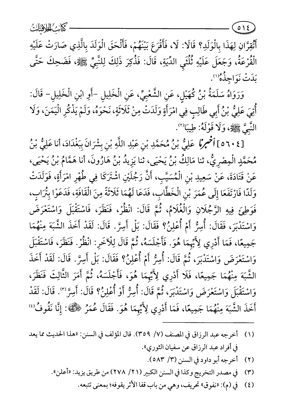 [5604] أخبرنا عَلِيُّ بْنُ مُحَمَّدِ بْنِ عَبْدِ اللَّهِ بْنِ بِشْرَانَ بِبَغْدَادَ، أنا عَلِيُّ بْنُ مُحَمَّدٍ الْمِصْرِيُّ، ثنا مَالِكُ بْنُ يَحْيَى، ثنا يَزِيدُ بْنُ هَارُونَ، أنا هَمَّامُ بْنُ يَحْيَى، عَنْ قَتَادَةَ، عَنْ سَعِيدِ بْنِ الْمُسَيَّبِ، أَنَّ رَجُلَيْنِ اشْتَرَكَا فِي طُهْرِ امْرَأَةٍ، فَوَلَدَتْ وَلَدًا فَارْتَفَعَا إِلَى عُمَرَ بْنِ الْخَطَّابِ، فَدَعَا لَهُمَا ثَلَاثَةً مِنَ الْقَافَةِ، فَدَعَوْا بِتُرَابٍ، فَوَطِئَ فِيهِ الرَّجُلَانِ وَالْغُلَامُ، ثُمَّ قَالَ: انْظُرْ، فَنَظَرَ، فَاسْتَقْبَلَ وَاسْتَعْرَضَ وَاسْتَدْبَرَ، فَقَالَ: أُسِرُّ أَمْ أُعْلِنُ؟ فَقَالَ: بَلْ أَسِرَّ. قَالَ: لَقَدْ أَخَذَ الشَّبَهَ مِنْهُمَا جَمِيعًا، فَمَا أَدْرِي لِأَيِّهِمَا هُوَ. فَأَجْلَسَهُ، ثُمَّ قَالَ لِلْآخَرِ: انْظُرْ. فَنَظَرَ، فَاسْتَقْبَلَ وَاسْتَعْرَضَ وَاسْتَدْبَرَ، ثُمَّ قَالَ: أُسِرُّ أَمْ أُعْلِنُ؟ فَقَالَ: بَلْ أَسِرَّ. قَالَ: لَقَدْ أَخَذَ الشَّبَهَ مِنْهُمَا جَمِيعًا، فَلَا أَدْرِي لِأَيِّهِمَا هُوَ، فَأَجْلَسَهُ، ثُمَّ أَمَرَ الثَّالِثَ فَنَظَرَ، وَاسْتَقْبَلَ وَاسْتَعْرَضَ وَاسْتَدْبَرَ، ثُمَّ قَالَ: أُسِرُّ أَوْ أُعْلِنُ؟ قَالَ: أَسِرَّ (¬3). قَالَ: لَقَدْ أَخَذَ الشَّبَهَ مِنْهُمَا جَمِيعًا، فَمَا أَدْرِي لِأَيِّهِمَا هُوَ. فَقَالَ عُمَرُ - رضي الله عنه -: إِنَّا نَقُوفُ (¬4)