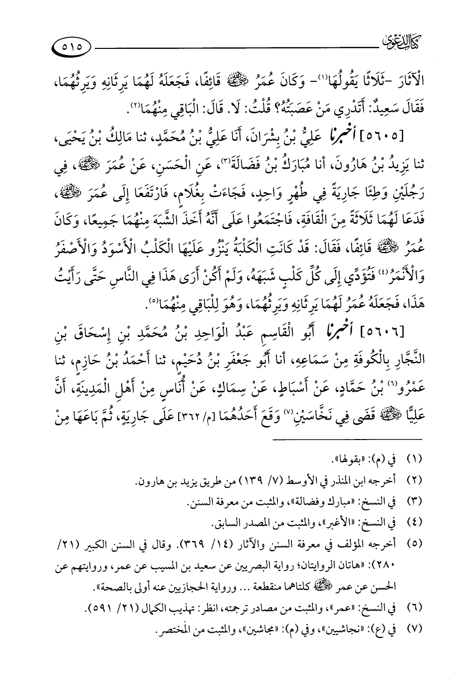 [5605] أخبرنا عَلِيُّ بْنُ بِشْرَانَ، أَنَا عَلِيُّ بْنُ مُحَمَّدٍ، ثنا مَالِكُ بْنُ يَحْيَى، ثنا يَزِيدُ بْنُ هَارُونَ، أنا مُبَارَكُ بْنُ فَضَالَةَ (¬3)، عَنِ الْحَسَنِ، عَنْ عُمَرَ - رضي الله عنه -، فِي رَجُلَيْنِ وَطِئَا جَارِيَةً فِي طُهْرٍ وَاحِدٍ، فَجَاءَتْ بِغُلَامٍ، فَارْتَفَعَا إِلَى عُمَرَ - رضي الله عنه -، فَدَعَا لَهُمَا ثَلَاثَةً مِنَ الْقَافَةِ، فَاجْتَمَعُوا عَلَى أَنَّهُ أَخَذَ الشَّبَهَ مِنْهُمَا جَمِيعًا، وَكَانَ عُمَرُ - رضي الله عنه - قَائِفًا، فَقَالَ: قَدْ كَانَتِ الْكَلْبَةُ يَنْزُو عَلَيْهَا الْكَلْبُ الْأَسْوَدُ وَالْأَصْفَرُ وَالْأَنْمَرُ (¬4) فَتُؤَدِّي إِلَى كُلِّ كَلْبٍ شَبَهَهُ، وَلَمْ أَكُنْ أَرَى هَذَا فِي النَّاسِ حَتَّى رَأَيْتُ هَذَا، فَجَعَلَهُ عُمَرُ لَهُمَا يَرِثَانِهِ وَيَرِثُهُمَا، وَهُوَ لِلْبَاقِي مِنْهُمَا (¬5).