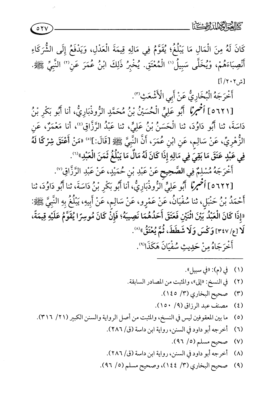 [5622] أخبرنا أَبُو عَلِيٍّ الرُّوذْبَارِيُّ، أنا أَبُو بَكْرِ بْنُ دَاسَةَ، ثنا أَبُو دَاوُدَ، ثنا أَحْمَدُ بْنُ حَنْبَلٍ، ثنا سُفْيَانُ، عَنْ عَمْرٍو، عَنْ سَالِمٍ، عَنْ أَبِيهِ، يَبْلُغُ بِهِ النَّبِيَّ - صلى الله عليه وسلم -: "إِذَا كَانَ الْعَبْدُ بَيْنَ اثْنَيْنِ فَعَتَقَ أَحَدُهُمَا نَصِيبَهُ؛ فَإِنْ كَانَ مُوسِرًا يُقَوَّمُ عَلَيْهِ قِيمَةً، لَا وَكْسَ وَلَا شَطَطَ، ثُمَّ يُعْتَقُ" (¬8).