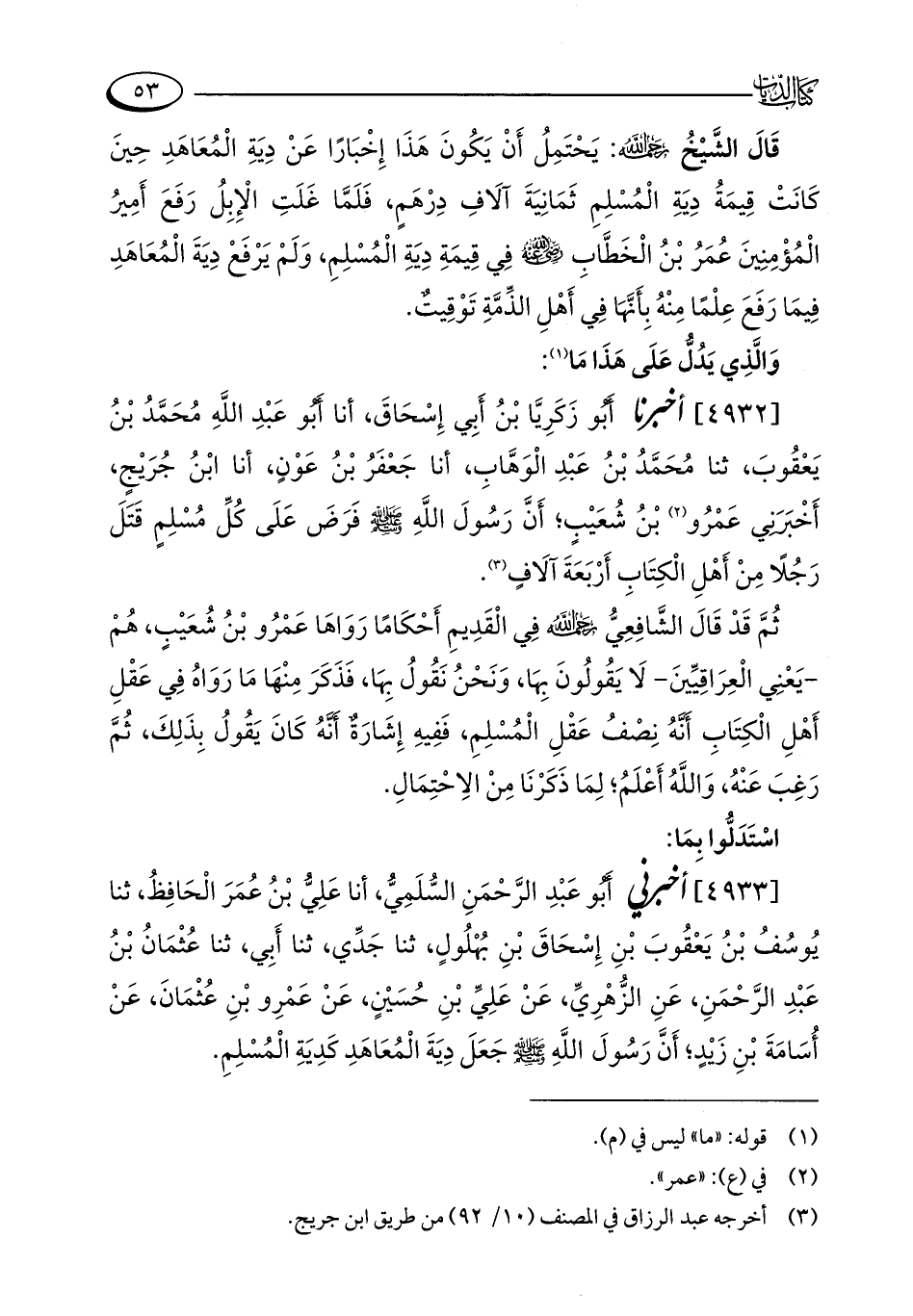 [4932] أخبرنا أَبُو زَكَرِيَّا بْنُ أَبِي إِسْحَاقَ، أنا أَبُو عَبْدِ اللَّهِ مُحَمَّدُ بْنُ يَعْقُوبَ، ثنا مُحَمَّدُ بْنُ عَبْدِ الْوَهَّابِ، أنا جَعْفَرُ بْنُ عَوْنٍ، أنا ابْنُ جُرَيْجٍ، أَخْبَرَنِي عَمْرُو (¬2) بْنُ شُعَيْبٍ؛ أَنَّ رَسُولَ اللَّهِ - صلى الله عليه وسلم - فَرَضَ عَلَى كُلِّ مُسْلِمٍ قَتَلَ رَجُلًا مِنْ أَهْلِ الْكِتَابِ أَرْبَعَةَ آلَافٍ (¬3).