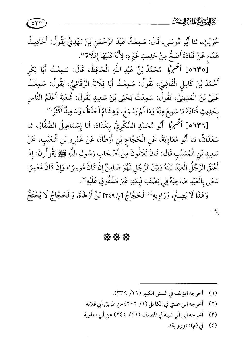 حُرَيْثٍ، ثنا أَبُو مُوسَى، قَالَ: سَمِعْتُ عَبْدَ الرَّحْمَنِ بْنَ مَهْدِيٍّ يَقُولُ: أَحَادِيثُ هَمَّامٍ عَنْ قَتَادَةَ أَصَحُّ مِنْ حَدِيثِ غَيْرِهِ؛ لِأَنَّهُ كَتَبَهَا إِمْلَاءً (¬1).