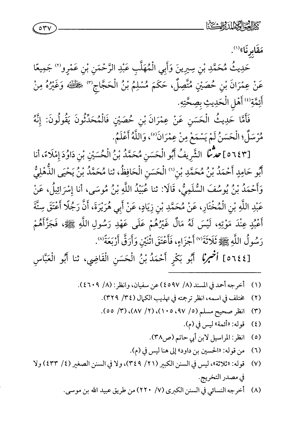 حَدِيثُ مُحَمَّدِ بْنِ سِيرِينَ وَأَبِي الْمُهَلَّبِ عَبْدِ الرَّحْمَنِ بْنِ عَمْرٍو (¬2) جَمِيعًا عَنْ عِمْرَانَ بْنِ حُصَيْنٍ مُتَّصِلٌ، حَكَمَ مُسْلِمُ بْنُ الْحَجَّاجِ (¬3) - رحمه الله - وَغَيْرُهُ مِنْ أَئِمَّةِ (¬4) أَهْلِ الْحَدِيثِ بِصِحَّتِهِ.