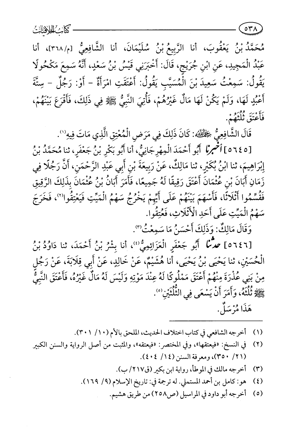 مُحَمَّدُ بْنُ يَعْقُوبَ، أنا الرَّبِيعُ بْنُ سُلَيْمَانَ، أنا الشَّافِعِيُّ, أنا عَبْدُ الْمَجِيدِ، عَنِ ابْنِ جُرَيْجٍ، قَالَ: أَخْبَرَنِي قَيْسُ بْنُ سَعْدٍ، أَنَّهُ سَمِعَ مَكْحُولًا يَقُولُ: سَمِعْتُ سَعِيدَ بْنَ الْمُسَيَّبِ يَقُولُ: أَعْتَقَتِ امْرَأَةٌ - أَوْ: رَجُلٌ - سِتَّةَ أَعْبُدٍ لَهَا، وَلَمْ يَكُنْ لَهَا مَالٌ غَيْرُهُمْ، فَأُتِيَ النَّبِيُّ - صلى الله عليه وسلم - فِي ذَلِكَ، فَأَقْرَعَ بَيْنَهُمْ، فَأَعْتَقَ ثُلُثَهُمْ.