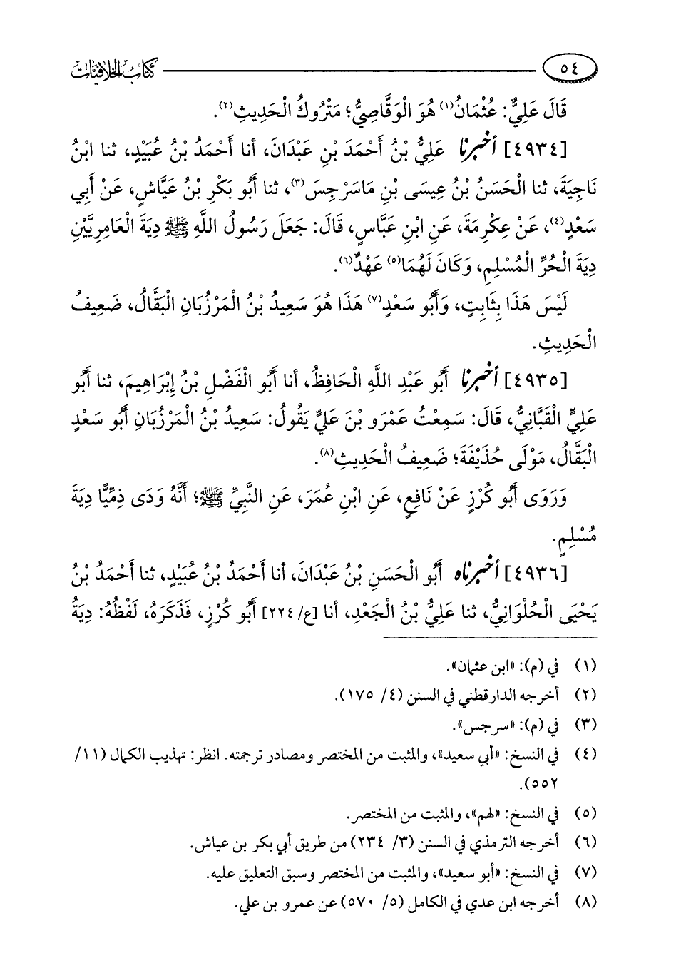 [4935] أخبرنا أَبُو عَبْدِ اللَّهِ الْحَافِظُ، أنا أَبُو الْفَضْلِ بْنُ إِبْرَاهِيمَ، ثنا أَبُو عَلِيٍّ الْقَبَّانِيُّ، قَالَ: سَمِعْتُ عَمْرَو بْنَ عَليٍّ يَقُولُ: سَعِيدُ بْنُ الْمَرْزُبَانِ أَبُو سَعْدٍ الْبَقَّالُ، مَوْلَى حُذَيْفَةَ؛ ضَعِيفُ الْحَدِيثِ (¬8).