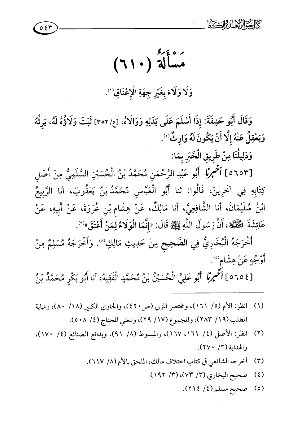 [5653] أخبرنا أَبُو عَبْدِ الرَّحْمَنِ مُحَمَّدُ بْنُ الْحُسَيْنِ السُّلَمِيُّ مِنْ أَصْلِ كِتَابِهِ فِي آخَرِينَ، قَالُوا: ثنا أَبُو الْعَبَّاسِ مُحَمَّدُ بْنُ يَعْقُوبَ، أنا الرَّبِيعُ بْنُ سُلَيْمَانَ، أنا الشَّافِعِيُّ، أنا مَالِكٌ، عَنْ هِشَامِ بْنِ عُرْوَةَ، عَنْ أَبِيهِ، عَنْ عَائِشَةَ - رضي الله عنها -، أَنَّ رَسُولَ اللَّهِ - صلى الله عليه وسلم - قَالَ: "إِنَّمَا الْوَلَاءُ لِمَنْ أَعْتَقَ" (¬3).