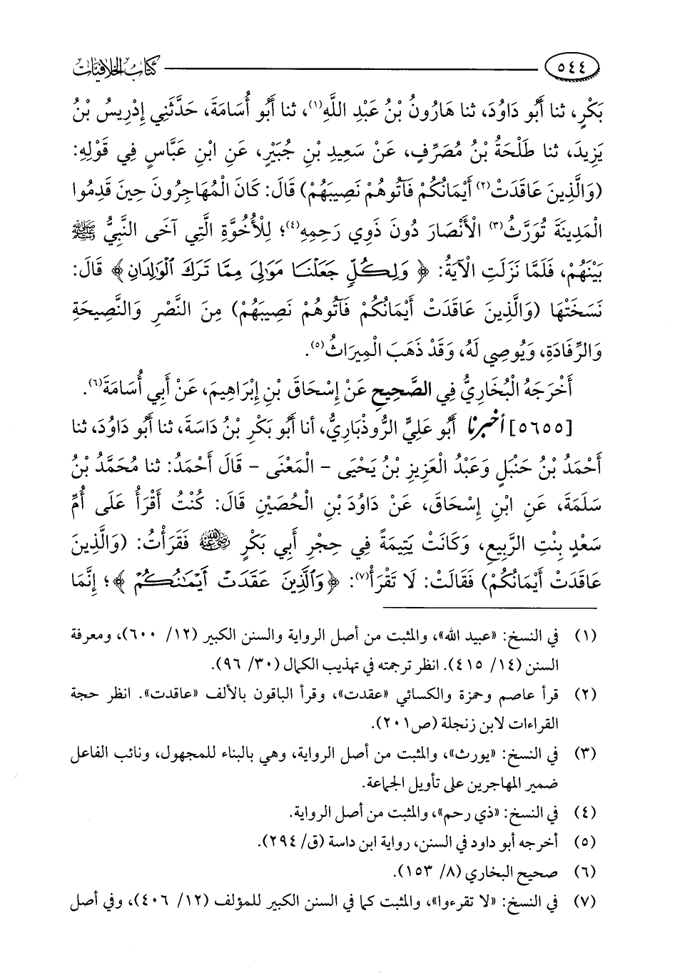 بَكْرٍ، ثنا أَبُو دَاوُدَ، ثنا هَارُونُ بْنُ عَبْدِ اللَّهِ (¬1)، ثنا أَبُو أُسَامَةَ، حَدَّثَنِي إِدْرِيسُ بْنُ يَزِيدَ، ثنا طَلْحَةُ بْنُ مُصَرِّفٍ، عَنْ سَعِيدِ بْنِ جُبَيْرٍ، عَنِ ابْنِ عَبَّاسٍ فِي قَوْلِهِ: (وَالَّذِينَ عَاقَدَتْ (¬2) أَيْمَانُكُمْ فَآتُوهُمْ نَصِيبَهُمْ) قَالَ: كَانَ الْمُهَاجِرُونَ حِينَ قَدِمُوا الْمَدِينَةَ تُوَرَّثُ (¬3) الْأَنْصَارَ دُونَ ذَوِي رَحِمِهِ (¬4)؛ لِلْأُخُوَّةِ الَّتِي آخَى النَّبِيُّ - صلى الله عليه وسلم - بَيْنَهُمْ، فَلَمَّا نَزَلَتِ الْآيَةُ: {وَلِكُلٍّ جَعَلْنَا مَوَالِيَ مِمَّا تَرَكَ الْوَالِدَانِ} قَالَ: نَسَخَتْهَا (وَالَّذِينَ عَاقَدَتْ أَيْمَانُكُمْ فَآتُوهُمْ نَصِيبَهُمْ) مِنَ النَّصْرِ وَالنَّصِيحَةِ وَالرِّفَادَةِ، وَيُوصِي لَهُ، وَقَدْ ذَهَبَ الْمِيرَاثُ (¬5).