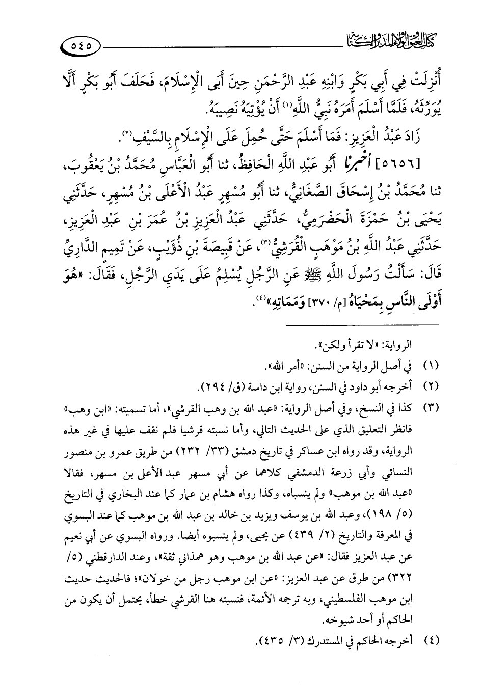 (¬3) كذا في النسخ، وفي أصل الرواية: "عبد الله بن وهب القرشي"، أما تسميته: "ابن وهب" فانظر التعليق الذي على الحديث التالي، وأما نسبته قرشيا فلم نقف عليها في غير هذه الرواية، وقد رواه ابن عساكر في تاريخ دمشق (33/ 232) من طريق عمرو بن منصور النسائي وأبي زرعة الدمشقي كلاهما عن أبي مسهر عبد الأعلى بن مسهر، فقالا "عبد الله بن موهب" ولم ينسباه، وكذا رواه هشام بن عمار كما عند البخاري في التاريخ (5/ 198)، وعبد الله بن يوسف ويزيد بن خالد بن عبد الله بن موهب كما عند البسوي في المعرفة والتاريخ (2/ 439) عن يحيى، ولم ينسبوه أيضًا. ورواه البسوي عن أبي نعيم عن عبد العزيز فقال: "عن عبد الله بن موهب وهو همذاني ثقة"، وعند الدارقطني (5/ 322) من طرق عن عبد العزيز: "عن ابن موهب رجل من خولان"؛ فالحديث حديث ابن موهب الفلسطيني، وبه ترجمه الأئمة، فنسبته هنا القرشي خطأ، يحتمل أن يكون من الحاكم أو أحد شيوخه.