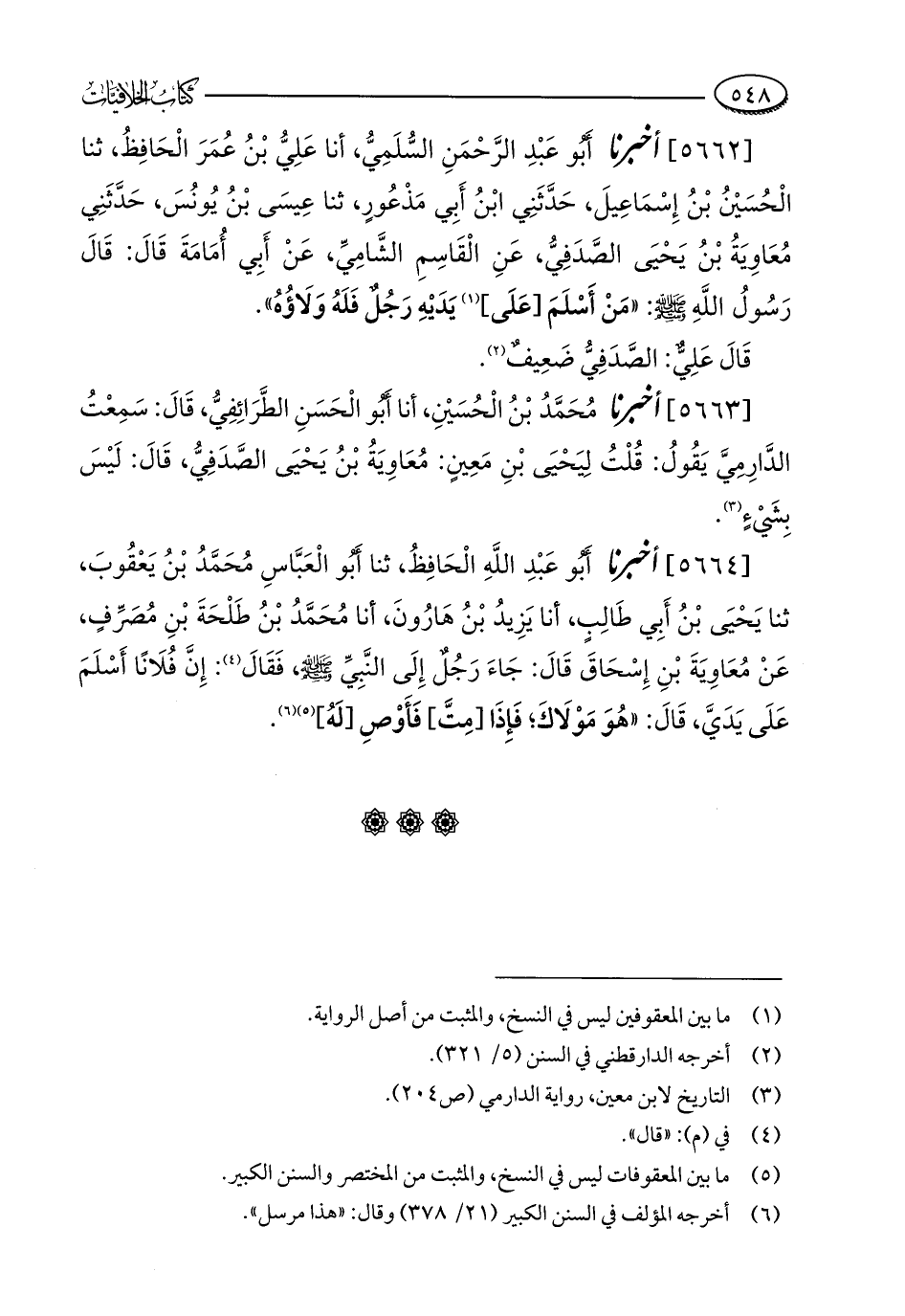 [5662] أخبرنا أَبُو عَبْدِ الرَّحْمَنِ السُّلَمِيُّ، أنا عَلِيُّ بْنُ عُمَرَ الْحَافِظُ، ثنا الْحُسَيْنُ بْنُ إِسْمَاعِيلَ، حَدَّثَنِي ابْنُ أَبِي مَذْعُورٍ، ثنا عِيسَى بْنُ يُونُسَ، حَدَّثَنِي مُعَاوِيَةُ بْنُ يَحْيَى الصَّدَفِيُّ، عَنِ الْقَاسِمِ الشَّامِيِّ، عَنْ أَبِي أُمَامَةَ قَالَ: قَالَ رَسُولُ اللَّهِ - صلى الله عليه وسلم -: "مَنْ أَسْلَمَ [عَلَى] (¬1) يَدَيْهِ رَجُلٌ فَلَهُ وَلَاؤُهُ".