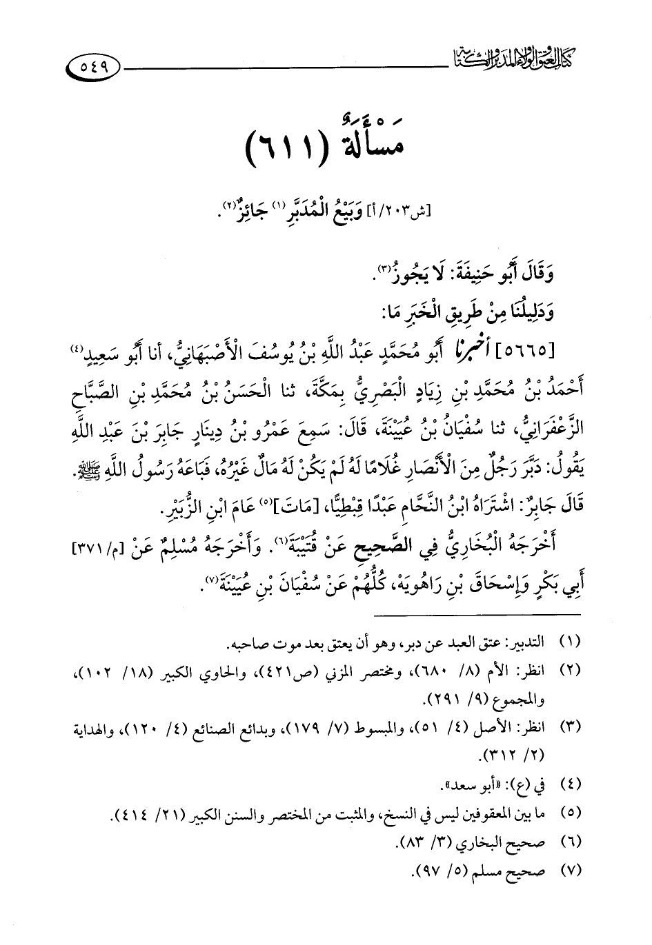 [5665] أخبرنا أَبُو مُحَمَّدٍ عَبْدُ اللَّهِ بْنُ يُوسُفَ الْأَصْبَهَانِيُّ، أنا أَبُو سَعِيدٍ (¬4) أَحْمَدُ بْنُ مُحَمَّدِ بْنِ زِيَادٍ الْبَصْرِيُّ بِمَكَّةَ، ثنا الْحَسَنُ بْنُ مُحَمَّدِ بْنِ الصَّبَّاحِ الزَّعْفَرَانِيُّ، ثنا سُفْيَانُ بْنُ عُيَيْنَةَ، قَالَ: سَمِعَ عَمْرُو بْنُ دِينَارٍ جَابِرَ بْنَ عَبْدِ اللَّهِ يَقُولُ: دَبَّرَ رَجُلٌ مِنَ الْأَنْصَارِ غُلَامًا لَهُ لَمْ يَكُنْ لَهُ مَالٌ غَيْرُهُ، فَبَاعَهُ رَسُولُ اللَّهِ - صلى الله عليه وسلم -. قَالَ جَابِرٌ: اشْتَرَاهُ ابْنُ النَّحَّامِ عَبْدًا قِبْطِيًّا، [مَاتَ] (¬5) عَامَ ابْنِ الزُّبَيْرِ.