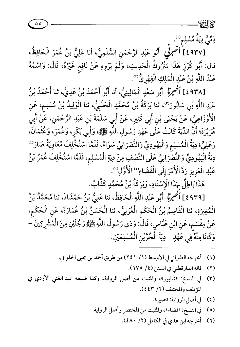 [4938] أخبرنا أَبُو سَعْدٍ الْمَالِينِيُّ، أنا أَبُو أَحْمَدَ بْنُ عَدِيٍّ، ثنا أَحْمَدُ بْنُ عَبْدِ اللَّهِ بْنِ سَابُورَ (¬3)، ثنا بَرَكَةُ بْنُ مُحَمَّدٍ الْحَلَبِيُّ، ثنا الْوَلِيدُ بْنُ مُسْلِمٍ، عَنِ الْأَوْزَاعِيِّ، عَنْ يَحْيَى بْنِ أَبِي كَثِيرٍ، عَنْ أَبِي سَلَمَةَ بْنِ عَبْدِ الرَّحْمَنِ، عَنْ أَبِي هُرَيْرَةَ؛ أَنَّ الدِّيَةَ كَانَتْ عَلَى عَهْدِ رَسُولِ اللَّهِ - صلى الله عليه وسلم -، وَأَبِي بَكْرٍ، وَعُمَرَ، وَعُثْمَانَ، وَعَلِيٍّ، دِيَةُ الْمُسْلِمِ وَالْيَهُودِيِّ وَالنَّصْرَانِيِّ سَوَاءٌ، فَلَمَّا اسْتُخْلِفَ مُعَاوِيَةُ صَارَ (¬4) دِيَةُ الْيَهُودِيِّ وَالنَّصْرَانِيِّ عَلَى النِّصْفِ مِنْ دِيَةِ الْمُسْلِمِ، فَلَمَّا اسْتُخْلِفَ عُمَرُ بْنُ عَبْدِ الْعَزِيزِ رَدَّ الْأَمْرَ إِلَى الْقَضَاءِ (¬5) الْأَوَّلِ (¬6).