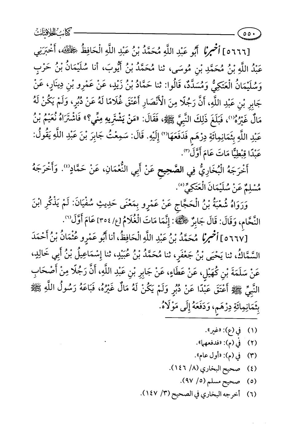[5666] أخبرنا أَبُو عَبْدِ اللَّهِ مُحَمَّدُ بْنُ عَبْدِ اللَّهِ الْحَافِظُ - رحمه الله -، أَخْبَرَنِي عَبْدُ اللَّهِ بْنُ مُحَمَّدِ بْنِ مُوسَى، ثنا مُحَمَّدُ بْنُ أَيُّوبَ، أنا سُلَيْمَانُ بْنُ حَرْبٍ وَسُلَيْمَانُ الْعَتَكِيُّ وَمُسَدَّدٌ، قَالُوا: ثنا حَمَّادُ بْنُ زَيْدٍ، عَنْ عَمْرِو بْنِ دِينَارٍ، عَنْ جَابِرِ بْنِ عَبْدِ اللَّهِ، أَنَّ رَجُلًا مِنَ الْأَنْصَارِ أَعْتَقَ غُلَامًا لَهُ عَنْ دُبُرٍ، وَلَمْ يَكُنْ لَهُ مَالٌ غَيْرُهُ (¬1)، فَبَلَغَ ذَلِكَ النَّبِيَّ - صلى الله عليه وسلم -، فَقَالَ: "مَنْ يَشْتَرِيهِ مِنِّي؟ " فَاشْتَرَاهُ نُعَيْمُ بْنُ عَبْدِ اللَّهِ بِثَمَانِمِائَةِ دِرْهَمٍ فَدَفَعَهَا (¬2) إِلَيْهِ. قَالَ: سَمِعْتُ جَابِرَ بْنَ عَبْدِ اللَّهِ يَقُولُ: عَبْدًا قِبْطِيًّا مَاتَ عَامَ أَوَّلَ (¬3).