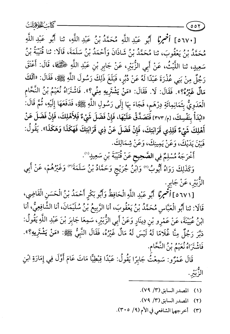 [5670] أخبرنا أَبُو عَبْدِ اللَّهِ مُحَمَّدُ بْنُ عَبْدِ اللَّهِ، ثنا أَبُو عَبْدِ اللَّهِ مُحَمَّدُ بْنُ يَعْقُوبَ، ثنا مُحَمَّدُ بْنُ شَاذَانَ وَأَحْمَدُ بْنُ سَلَمَةَ، قَالَا: ثنا قُتَيْبَةُ بْنُ سَعِيدٍ، ثنا اللَّيْثُ، عَنْ أَبِي الزُّبَيْرِ، عَنْ جَابِرِ بْنِ عَبْدِ اللَّهِ - رضي الله عنهما -، قَالَ: أَعْتَقَ رَجُلٌ مِنْ بَنِي عُذْرَةَ عَبْدًا لَهُ عَنْ دُبُرٍ، فَبَلَغَ ذَلِكَ رَسُولَ اللَّهِ - صلى الله عليه وسلم -، فَقَالَ: "أَلَكَ مَالٌ غَيْرُهُ؟ ". فَقَالَ: لَا. فَقَالَ: "مَنْ يَشْتَرِيهِ مِنِّي؟ ". فَاشْتَرَاهُ نُعَيْمُ بْنُ النَّحَّامِ الْعَدَوِيُّ بِثَمَانِمِائَةِ دِرْهَمٍ، فَجَاءَ بِهَا إِلَى رَسُولِ اللَّهِ - صلى الله عليه وسلم -، فَدَفَعَهَا إِلَيْهِ، ثمَّ قَالَ: "ابْدَأْ بِنَفْسِكَ، فَتَصَدَّقْ عَلَيْهَا، فَإِنْ فَضَلَ شَيْءٌ فِلأَهْلِكَ، فَإِنْ فَضَلَ عَنْ أَهْلِكَ شَيْءٌ فَلِذِي قَرَابَتِكَ، فَإِنْ فَضَلَ عَنْ ذِي قَرَابَتِكَ فَهَكَذَا وَهَكَذَا". يَقُولُ: فَبَيْنَ يَدَيْكَ، وَعَنْ يَمِينِكَ، وَعَنْ شِمَالِكَ.