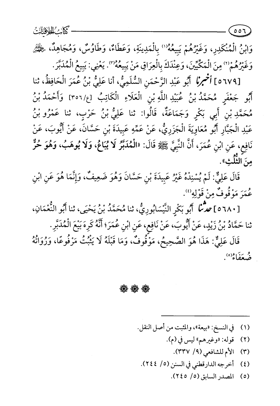 [5679] أخبرنا أَبُو عَبْدِ الرَّحْمَنِ السُّلَمِيُّ، أنا عَلِيُّ بْنُ عُمَرَ الْحَافِظُ، ثنا أَبُو جَعْفَرٍ مُحَمَّدُ بْنُ عُبَيْدِ اللَّهِ بْنِ الْعَلَاءِ الْكَاتِبُ وَأَحْمَدُ بْنُ مُحَمَّدِ بْنِ أَبِي بَكْرٍ وَجَمَاعَةٌ، قَالُوا: ثنا عَلِيُّ بْنُ حَرْبٍ، ثنا عَمْرُو بْنُ عَبْدِ الْجَبَّارِ أَبُو مُعَاوِيَةَ الْجَزَرِيُّ، عَنْ عَمِّهِ عَبِيدَةَ بْنِ حَسَّانَ، عَنْ أَيُّوبَ، عَنْ نَافِعٍ، عَن ابْن عُمَرَ، أَنَّ النَّبيَّ - صلى الله عليه وسلم - قالَ: "الْمُدَبَّرُ لَا يُبَاعُ، وَلَا يُوهَبُ، وَهُوَ حُرٌّ مِنَ الثُّلُثِ".