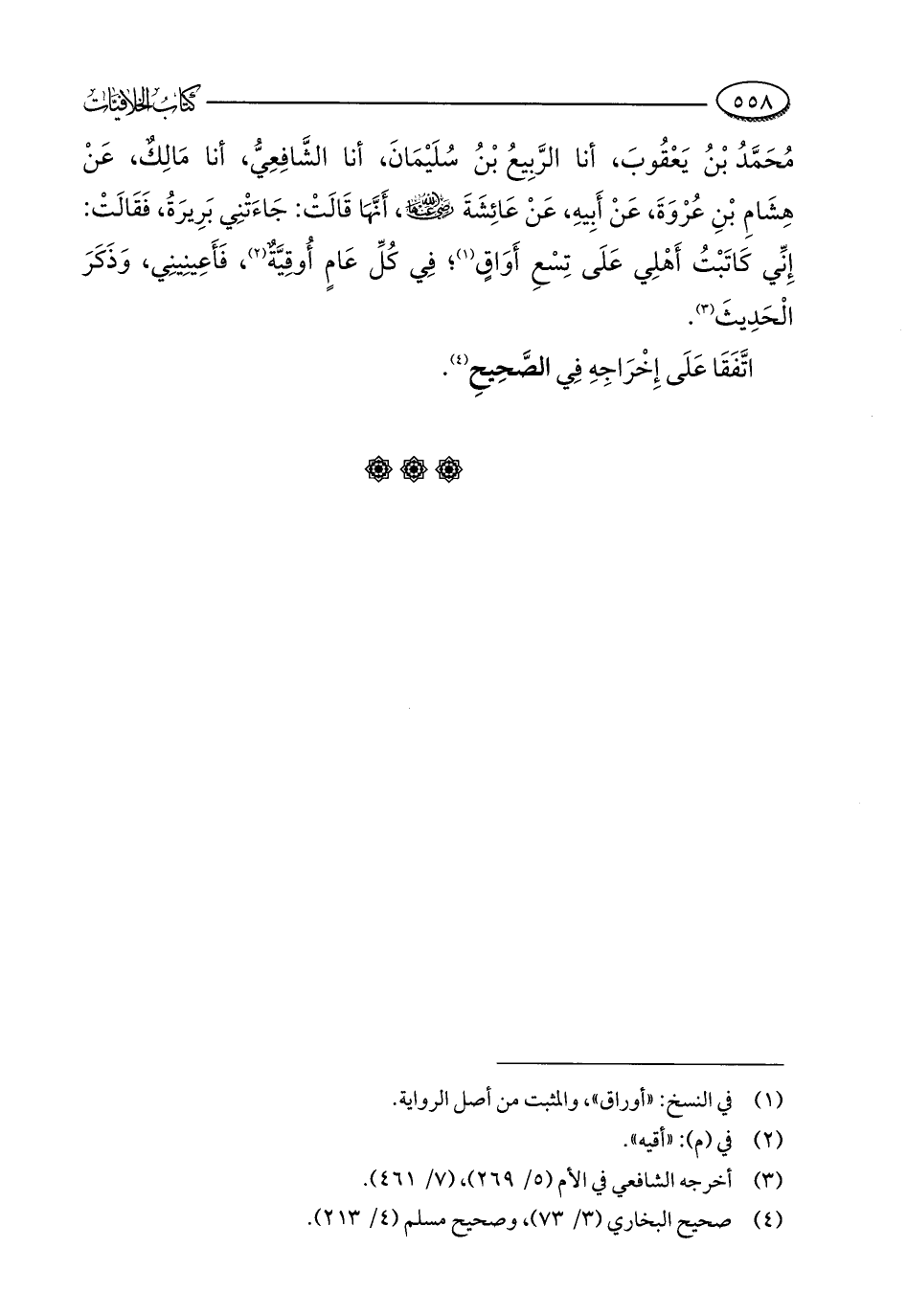 مُحَمَّدُ بْنُ يَعْقُوبَ، أنا الرَّبِيعُ بْنُ سُلَيْمَانَ، أنا الشَّافِعِيُّ، أنا مَالِكٌ، عَنْ هِشَامِ بْنِ عُرْوَةَ، عَنْ أَبِيهِ، عَنْ عَائِشَةَ - رضي الله عنها -، أَنَّهَا قَالَتْ: جَاءَتْنِي بَرِيرَةُ، فَقَالَتْ: إِنِّي كَاتَبْتُ أَهْلِي عَلَى تِسْعِ أَوَاقٍ (¬1)؛ فِي كُلِّ عَامٍ أُوقِيَّةٌ (¬2)، فَأَعِينِينِي، وَذَكَرَ الْحَدِيثَ (¬3).