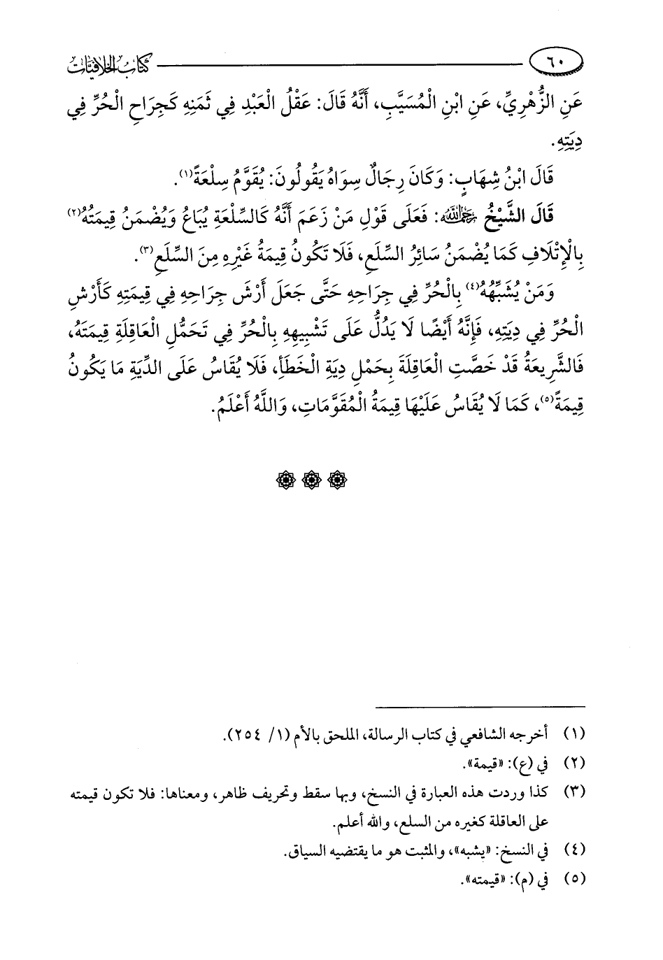 (¬3) كذا وردت هذه العبارة في النسخ، وبها سقط وتحريف ظاهر، ومعناها: فلا تكون قيمته على العاقلة كغيره من السلع، والله أعلم.