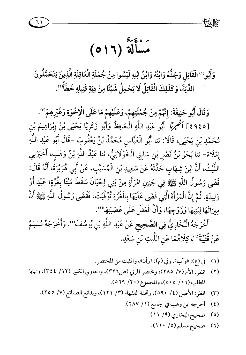 مَسْأَلَةٌ (516): وَأَبُو (¬1) الْقَاتِلِ وَجَدُّهُ وَابْنُهُ وَابْنُ ابْنِهِ لَيْسُوا مِنْ جُمْلَةِ الْعَاقِلَةِ الَّذِينَ يتَحَمَّلُونَ الدِّيَةَ، وَكَذَلِكَ الْقَاتِلُ لَا يَحْمِلُ شَيْئًا مِنْ دِيَةِ قَتِيلِهِ خَطَأً (¬2).