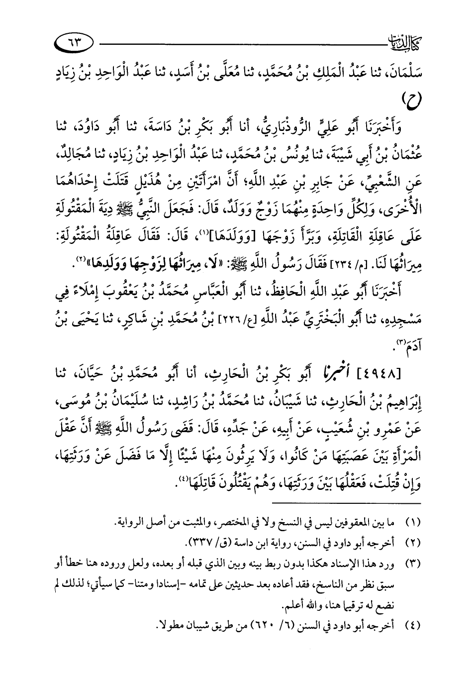 [4948] أخبرنا أَبُو بَكْرِ بْنُ الْحَارِثِ، أنا أَبُو مُحَمَّدِ بْنُ حَيَّانَ، ثنا إِبْرَاهِيمُ بْنُ الْحَارِثِ، ثنا شَيْبَانُ، ثنا مُحَمَّدُ بْنُ رَاشِدٍ، ثنا سُلَيْمَانُ بْنُ مُوسَى، عَنْ عَمْرِو بْنِ شُعَيْبٍ، عَنْ أَبِيهِ، عَنْ جَدِّهِ، قَالَ: قَضَى رَسُولُ اللَّهِ - صلى الله عليه وسلم - أَنَّ عَقْلَ الْمَرْأَةِ بَيْنَ عَصَبَتِهَا مَنْ كَانُوا، وَلَا يَرِثُونَ مِنْهَا شَيْئًا إِلَّا مَا فَضَلَ عَنْ وَرَثَتِهَا، وَإِنْ قُتِلَتْ، فَعَقْلُهَا بَيْنَ وَرَثَتِهَا، وَهُمْ يَقْتُلُونَ قَاتِلَهَا (¬4).
