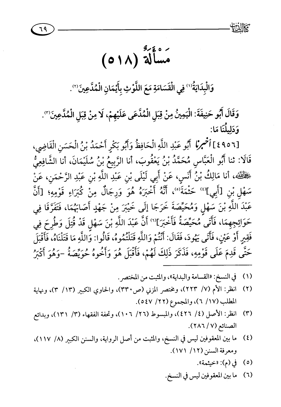 [4956] أخبرنا أَبُو عَبْدِ اللَّهِ الْحَافِظُ وَأَبُو بَكْرٍ أَحْمَدُ بْنُ الْحَسَنِ الْقَاضِي، قَالَا: ثنا أَبُو الْعَبَّاسِ مُحَمَّدُ بْنُ يَعْقُوبَ، أنا الرَّبِيعُ بْنُ سُلَيْمَانَ، أنا الشَّافِعِيُّ - رحمه الله -، أنا مَالِكُ بْنُ أَنَسٍ، عَنْ أَبِي لَيْلَى بْنِ عَبْدِ اللَّهِ بْنِ عَبْدِ الرَّحْمَنِ، عَنْ سَهْلِ بْنِ [أَبِي] (¬4) حَثْمَةَ (¬5)، أَنَّهُ أَخْبَرَهُ هُوَ وَرِجَالٌ مِنْ كُبَرَاءِ قَوْمِهِ؛ [أَنَّ عَبْدَ اللَّهِ بْنَ سَهْلٍ وَمُحَيِّصَةَ خَرَجَا إلَى خَيْبَرَ مِنْ جَهْدٍ أَصَابَهُمَا، فتفَرَّقَا فِي حَوَائِجِهِمَا، فَأَتَى مُحَيِّصَةُ فَأَخْبَرَ] (¬6) أَنَّ عَبْدَ اللَّهِ بْنَ سَهْلٍ قَدْ قُتِلَ وَطُرِحَ فِي فَقِيرٍ أَوْ عَيْنٍ، فَأَتَى يَهُودَ، فَقَالَ: أَنْتُمْ وَاللَّهِ قَتَلْتُمُوهُ، قَالُوا: وَاللَّهِ مَا قَتَلْنَاهُ، فَأَقْبَلَ حَتَّى قَدِمَ عَلَى قَوْمِهِ، فَذَكَرَ ذَلِكَ لَهُمْ، فَأَقْبَلَ هُوَ وَأَخُوهُ حُوَيِّصَةُ - وَهُوَ أَكْبَرُ