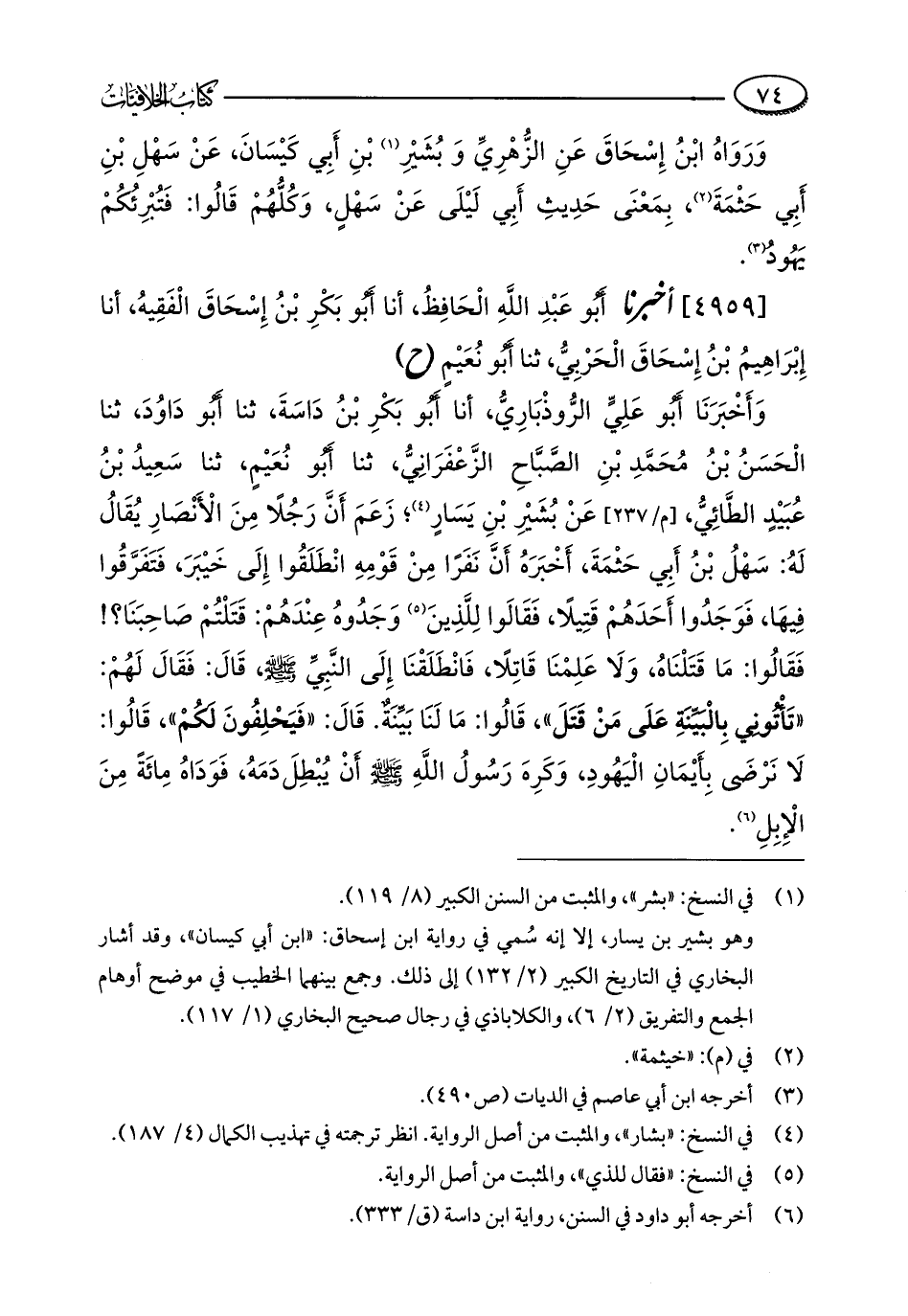 وَأَخْبَرَنَا أَبُو عَلِيٍّ الرُّوذْبَارِيُّ، أنا أَبُو بَكْرِ بْنُ دَاسَةَ، ثنا أَبُو دَاوُدَ، ثنا الْحَسَنُ بْنُ مُحَمَّدِ بْنِ الصَّبَّاحِ الزَّعْفَرَانِيُّ، ثنا أَبُو نُعَيْمٍ، ثنا سَعِيدُ بْنُ عُبَيْدٍ الطَّائِيُّ، عَنْ بُشَيْرِ بْنِ يَسَارٍ (¬4)؛ زَعَمَ أَنَّ رَجُلًا مِنَ الْأَنْصَارِ يُقَالُ لَهُ: سَهْلُ بْنُ أَبِي حَثْمَةَ، أَخْبَرَهُ أَنَّ نَفَرًا مِنْ قَوْمِهِ انْطَلَقُوا إِلَى خَيْبَرَ، فَتَفَرَّقُوا فِيهَا، فَوَجَدُوا أَحَدَهُمْ قَتِيلًا، فَقَالَوا لِلَّذِينَ (¬5) وَجَدُوهُ عِنْدَهُمْ: قَتَلْتُمْ صَاحِبَنَا؟ ! فَقَالُوا: مَا قَتَلْنَاهُ، وَلَا عَلِمْنَا قَاتِلًا، فَانْطَلَقْنَا إِلَى النَّبِيِّ - صلى الله عليه وسلم -، قَالَ: فَقَالَ لَهُمْ: "تَأْتُونِي بِالْبَيِّنَةِ عَلَى مَنْ قَتَلَ"، قَالُوا: مَا لَنَا بَيِّنَةٌ. قَالَ: "فَيَحْلِفُونَ لَكُمْ"، قَالُوا: لَا نَرْضَى بِأَيْمَانِ الْيَهُودِ، وَكَرِهَ رَسُولُ اللَّهِ - صلى الله عليه وسلم - أَنْ يُبْطِلَ دَمَهُ، فَوَدَاهُ مِائَةً مِنَ الْإِبِلِ (¬6).