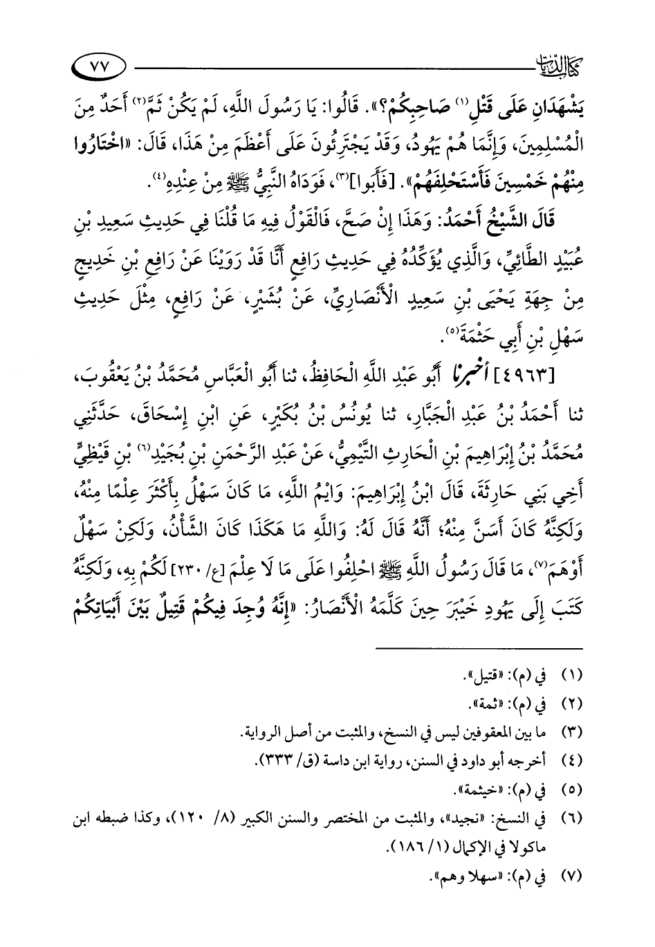 [4963] أخبرنا أَبُو عَبْدِ اللَّهِ الْحَافِظُ، ثنا أَبُو الْعَبَّاسِ مُحَمَّدُ بْنُ يَعْقُوبَ، ثنا أَحْمَدُ بْنُ عَبْدِ الْجَبَّارِ، ثنا يُونُسُ بْنُ بُكَيْرٍ، عَنِ ابْنِ إِسْحَاقَ، حَدَّثَنِي مُحَمَّدُ بْنُ إِبْرَاهِيمَ بْنِ الْحَارِثِ التَّيْمِيُّ، عَنْ عَبْدِ الرَّحْمَنِ بْنِ بُجَيْدِ (¬6) بْنِ قَيْظِيٍّ أَخِي بَنِي حَارِثَةَ، قَالَ ابْنُ إِبْرَاهِيمَ: وَايْمُ اللَّهِ، مَا كَانَ سَهْلُ بِأَكْثَرَ عِلْمًا مِنْهُ، وَلَكِنَّهُ كَانَ أَسَنَّ مِنْهُ؛ أَنَّهُ قَالَ لَهُ: وَاللَّهِ مَا هَكَذَا كَانَ الشَّأْنُ، وَلَكِنْ سَهْلٌ أَوْهَمَ (¬7)، مَا قَالَ رَسُولُ اللَّهِ - صلى الله عليه وسلم - احْلِفُوا عَلَى مَا لَا عِلْمَ لَكُمْ بِهِ، وَلَكِنَّهُ كَتَبَ إِلَى يَهُودِ خَيْبَرَ حِينَ كَلَّمَهُ الْأَنْصَارُ: "إِنَّهُ وُجِدَ فِيكُمْ قَتِيلٌ بَيْنَ أَبْيَاتِكُمْ
