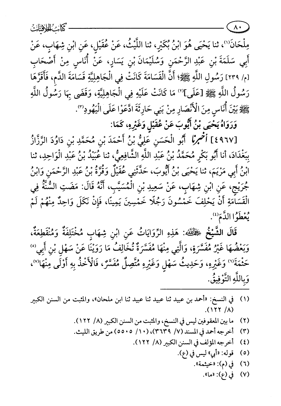 [4967] أخبرنا أَبُو الْحَسَنِ عَلِيُّ بْنُ أَحْمَدَ بْنِ مُحَمَّدِ بْنِ دَاوُدَ الرَّزَّازُ بِبَغْدَادَ، أنا أَبُو بَكْرٍ مُحَمَّدُ بْنُ عَبْدِ اللَّهِ الشَّافِعِيُّ، ثنا عُبَيْدُ بْنُ عَبْدِ الْوَاحِدِ، ثنا ابْنُ أَبِي مَرْيَمَ، ثنا يَحْيَى بْنُ أَيُّوبَ، حَدَّثَنِي عُقَيْلٌ وَقُرَّةُ بْنُ عَبْدِ الرَّحْمَنِ وَابْنُ جُرَيْجٍ، عَنِ ابْنِ شِهَابٍ، عَنْ سَعِيدِ بْنِ الْمُسَيَّبِ، أَنَّهُ قَالَ: مَضَتِ السُّنَّةُ فِي الْقَسَامَةِ أَنْ يَحْلِفَ خَمْسُونَ رَجُلًا خَمْسِينَ يَمِينًا، فَإِنْ نَكَلَ وَاحِدٌ مِنْهُمْ لَمْ يُعْطَوُا الدَّمَ (¬4).