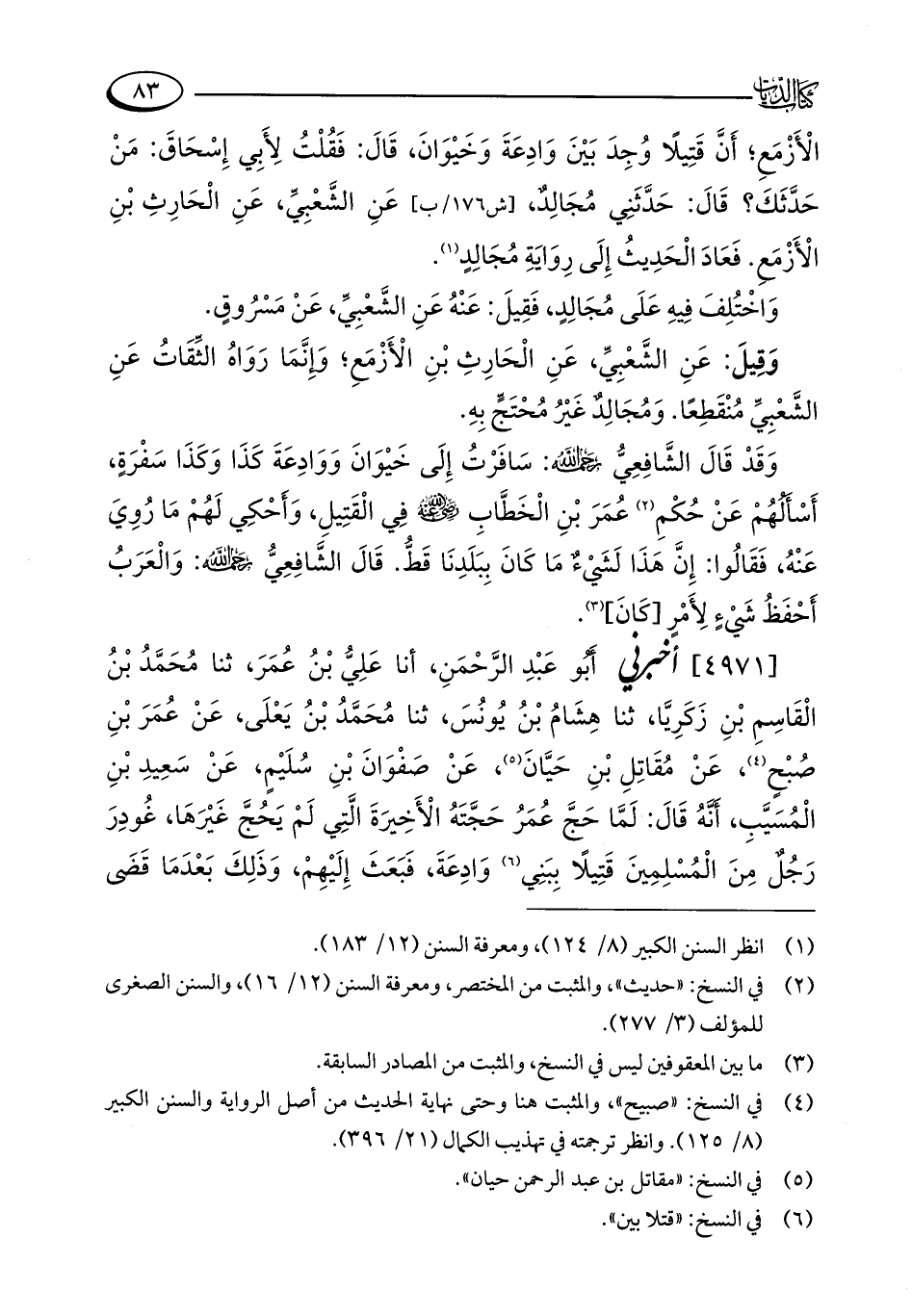 الْأَزْمَعِ؛ أَنَّ قَتِيلًا وُجِدَ بَيْنَ وَادِعَةَ وَخَيْوَانَ، قَالَ: فَقُلْتُ لِأَبِي إِسْحَاقَ: مَنْ حَدَّثَكَ؟ قَالَ: حَدَّثَنِي مُجَالِدٌ، عَنِ الشَّعْبِيِّ، عَنِ الْحَارِثِ بْنِ الْأَزْمَعِ. فَعَادَ الْحَدِيثُ إِلَى رِوَايَةِ مُجَالِدٍ (¬1).