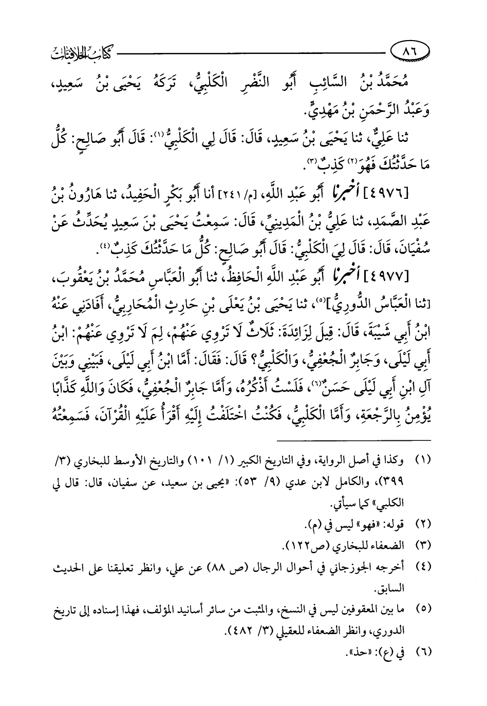 [4976] أخبرنا أَبُو عَبْدِ اللَّهِ، أنا أَبُو بَكْرٍ الْحَفِيدُ، ثنا هَارُونُ بْنُ عَبْدِ الصَّمَدِ، ثنا عَلِيُّ بْنُ الْمَدِينِيِّ، قَالَ: سَمِعْتُ يَحْيَى بْنَ سَعِيدٍ يُحَدِّثُ عَنْ سُفْيَانَ، قَالَ: قَالَ لِيَ الْكَلْبِيُّ: قَالَ أَبُو صَالِحٍ: كُلُّ مَا حَدَّثْتُكَ كَذِبٌ (¬4).