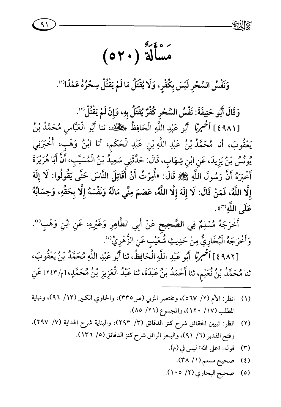 مَسْأَلَةٌ (520): وَنَفْسُ السِّحْرِ لَيْسَ بِكُفْرٍ، وَلَا يُقْتَلُ مَا لَمْ يَقْتُلْ سِحْرُهُ عَمْدًا (¬1).