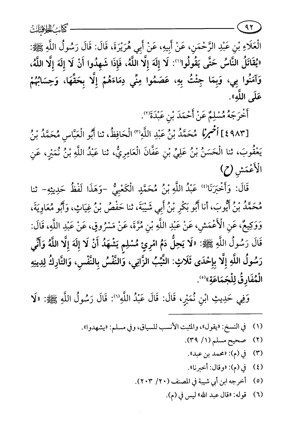 الْعَلَاءِ بْنِ عَبْدِ الرَّحْمَنِ، عَنْ أَبِيهِ، عَنْ أَبِي هُرَيْرَةَ، قَالَ: قَالَ رَسُولُ اللَّهِ - صلى الله عليه وسلم -: "يُقَاتَلُ النَّاسُ حَتَّى يَقُولُوا (¬1): لَا إِلَهَ إِلَّا اللَّهُ، فَإِذَا شَهِدُوا أَنْ لَا إِلَهَ إِلَّا اللَّهُ، وَآمَنُوا بِي، وَبِمَا جِئْتُ بِهِ، عَصَمُوا مِنِّي دِمَاءَهُمْ إِلَّا بِحَقِّهَا، وَحِسَابُهُمْ عَلَى اللَّهِ".
