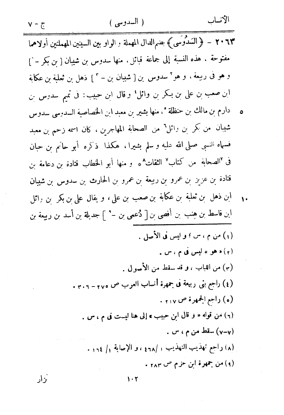 بضم الدال المهملة والواو بين السينين المهملتين أولاهما مفتوحة، هذه النسبة إلى جماعة قبائل، منها سدوس بن شيبان [بن بكر-[1]] وهو في ربيعة، وهو [2] سدوس بن [شيبان بن-[3]] ذهل بن ثعلبة بن عكابة ابن صعب بن على بن بكر بن وائل [4] وقال ابن حبيب: في تميم سدوس بن دارم بن مالك بن حنظلة [5] ، منها بشير بن معبد ابن الخصاصية السدوسي سدوس شيبان من بكر بن وائل [6] من الصحابة المهاجرين، كان اسمه زحم بن معبد فسماه النبي صلى الله عليه وسلم بشيرا، هكذا ذكره أبو حاتم بن حبان في [7] الصحابة من كتاب [7] الثقات [8] ومنها أبو الخطاب قتادة بن دعامة بن قتادة بن عزيز بن عمرو بن ربيعة بن عمرو بن الحارث بن سدوس بن شيبان ابن ذهل بن ثعلبة بن عكابة بن صعب بن على، ويقال على بن بكر بن وائل ابن قاسط بن هنب بن أفصى بن [دعمي بن-[9]] جديلة بن أسد بن ربيعة بن
