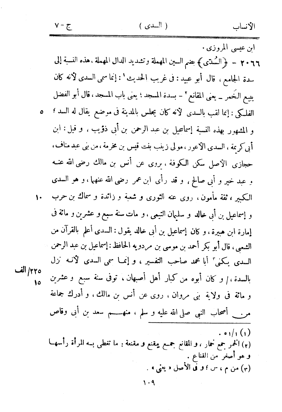 بضم السين المهملة وتشديد الدال المهملة، هذه النسبة إلى سدة الجامع، قال أبو عبيد: في غريب الحديث [1] : إنما سمى السدي لأنه كان يبيع الخمر- يعنى المقانع [2]- بسدة المسجد، يعنى باب المسجد، قال أبو الفضل الفلكي: إنما لقب بالسدي لأنه كان يجلس بالمدينة في موضع يقال له السد، والمشهور بهذه النسبة إسماعيل بن عبد الرحمن بن أبى ذؤيب، وقيل: ابن أبى كريمة، السدي الأعور، مولى زينب بنت قيس بن مخرمة، من بنى عبد مناف، حجازي الأصل سكن الكوفة، يروى عن أنس بن مالك رضى الله عنه وعبد خير وأبى صالح، وقد رأى ابن عمر رضى الله عنهما، وهو السدي الكبير، ثقة مأمون، روى عنه الثوري وشعبة وزائدة وسماك بن حرب وإسماعيل بن أبى خالد وسليمان التيمي، ومات سنة سبع وعشرين ومائة في إمارة ابن هبيرة، وكان إسماعيل بن أبى خالد يقول: السدي أعلم بالقرآن من الشعبي، قال أبو بكر أحمد بن موسى بن مردويه الحافظ: إسماعيل بن عبد الرحمن السدي يكنى [3] أبا محمد صاحب التفسير، وإنما سمى السدي لأنه نزل بالسدة،/ وكان أبوه من كبار أهل أصبهان، توفى سنة سبع وعشرين ومائة في ولاية بنى مروان، روى عن أنس بن مالك، وأدرك جماعة من أصحاب النبي صلى الله عليه وسلم، منهم سعد بن أبى وقاص