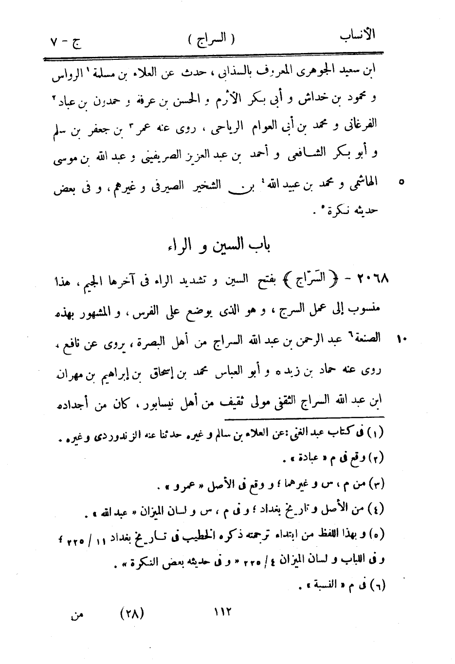 بفتح السين وتشديد الراء في آخرها الجيم، هذا منسوب إلى عمل السرج، وهو الّذي يوضع على الفرس، والمشهور بهذه الصنعة [6] عبد الرحمن بن عبد الله السراج من أهل البصرة، يروى عن نافع، روى عنه حماد بن زيد وأبو العباس محمد بن إسحاق بن إبراهيم بن مهران ابن عبد الله السراج الثقفي مولى ثقيف من أهل نيسابور، كان من أجداده