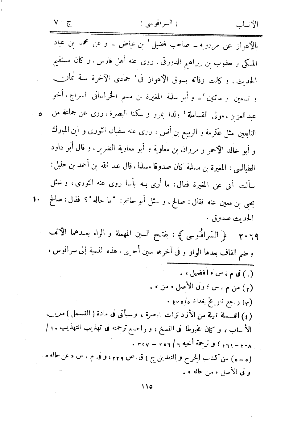 بالأهواز عن مردويه- صاحب فضيل [1] بن عياض- وعن محمد بن عباد المكيّ ويعقوب بن إبراهيم الدورقي، روى عنه أهل فارس، وكان مستقيم الحديث، وكانت وفاته بسوق الأهواز في [2] جمادى الآخرة سنة ثمان وتسعين ومائتين [3] وأبو سلمة المغيرة بن مسلم الخراساني السراج، أخو عبد العزيز، مولى القساملة [4] ولدا بمرو وسكنا البصرة، روى عن جماعة من التابعين مثل عكرمة والربيع بن أنس، روى عنه سفيان الثوري وابن المبارك وأبو خالد الأحمر ومروان بن معاوية وأبو معاوية الضرير، وقال أبو داود الطيالسي: المغيرة بن مسلمة كان صدوقا مسلما، قال عبد الله بن أحمد بن حنبل: