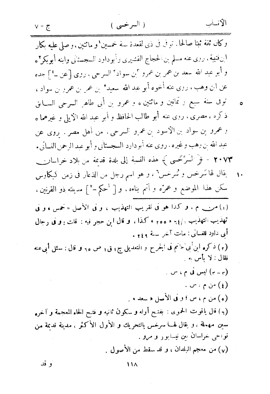وكان ثقة ثبتا صالحا، توفى في ذي القعدة سنة خمسين [1] ومائتين، وصلى عليه بكار ابن قتيبة، روى عنه مسلم بن الحجاج القشيري وأبو داود السجستاني وابنه أبو بكر [2] وأبو عبد الله سعد بن عمر بن عمرو [3] بن سواد [3] السرحى، روى [عن-[4]] جده عن ابن وهب، روى عنه أخوه أبو عبد الله سعيد [5] بن عمر بن عمرو بن سواد، توفى سنة سبع وثمانين ومائتين وعمرو بن أبى طاهر السرحى السابق ذكره، مصرى، روى عنه أبو طالب الحافظ وأبو عبد الله الأيلي وغيرهما وعمرو بن سواد بن الأسود بن عمرو السرحى، من أهل مصر، يروى عن عبد الله بن وهب وغيره، روى عنه أبو داود السجستاني وأبو عبد الرحمن النسائي.