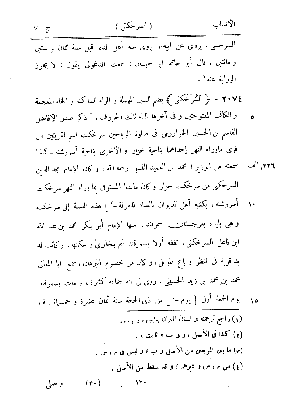 بضم السين المهملة والراء الساكنة والخاء المعجمة والكاف المفتوحتين وفي آخرها التاء ثالث الحروف، [ذكر صدر الأفاضل القاسم بن الحسين الخوارزمي في صلاة الرياحين سرخكت اسم لقريتين من قرى ما وراء النهر إحداهما بناحية خزار والأخرى بناحية أسروشنه- كذا سمعته من الوزير/ محمد بن العميد النسفي رحمه الله، وكان الإمام مجد الدين السرخكتى من سرخكت خزار وكان مات [2] المستوفي بما وراء النهر سرخكت أسروشنه، يكتبه أهل الديوان بالصاد للتفرقة-[3]] هذه النسبة إلى سرخكت وهي بليدة بغرجستان سمرقند، منها الإمام أبو بكر محمد بن عبد الله ابن فاعل السرخكتى، تفقه أولا بسمرقند ثم ببخارى وسكنها، وكانت له يد قوية في النظر وباع طويل، وكان من خصوم البرهان، سمع أبا المعالي محمد بن محمد بن زيد الحسيني، روى لي عنه جماعة كثيرة، ومات بسمرقند يوم الجمعة أول [يوم-[4]] من ذي الحجة سنة ثمان عشرة وخمسمائة،