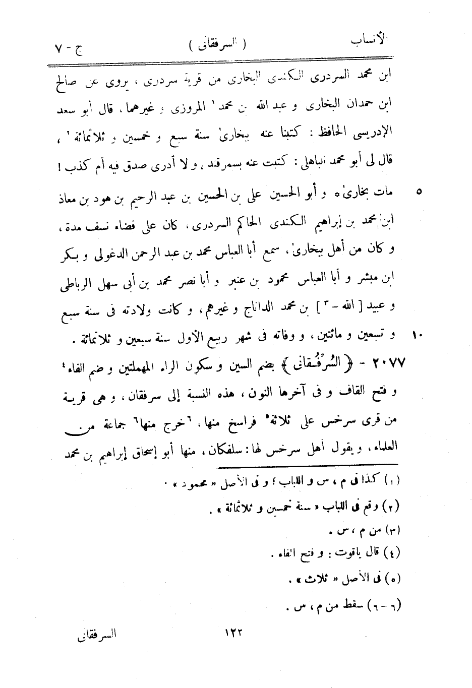 بضم السين وسكون الراء المهملتين وضم الفاء [4] وفتح القاف وفي آخرها النون، هذه النسبة إلى سرفقان، وهي قرية من قرى سرخس على ثلاثة [5] فراسخ منها، [6] خرج منها [6] جماعة من العلماء، ويقول أهل سرخس لها: سلفكان، منها أبو إسحاق إبراهيم بن محمد