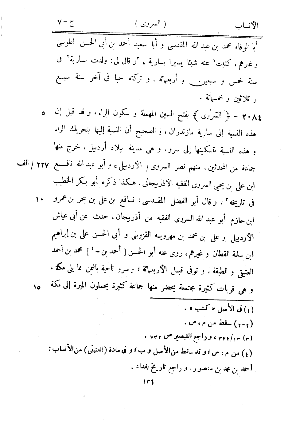 بفتح السين المهملة وسكون الراء، وقد قيل إن هذه النسبة إلى سارية مازندران، والصحيح أن النسبة إليها بتحريك الراء وهذه النسبة بتسكينها إلى سرو، وهي مدينة ببلاد أردبيل، خرج منها جماعة من المحدثين، منهم نصر السروي/ الأردبيلي وأبو عبد الله نافع ابن على بن يحيى السروي الفقيه الأذربيجاني، هكذا ذكره أبو بكر الخطيب في تاريخه [3] ، وقال أبو الفضل المقدسي: نافع بن على بن بحر بن عمرو ابن حازم أبو عبد الله السروي الفقيه من أذربيجان، حدث عن أبى عياش الأردبيلي وعلى بن محمد بن مهرويه القزويني وأبى الحسن على بن إبراهيم ابن سلمة القطان وغيرهم، روى عنه أبو الحسن [أحمد بن-[4]] محمد بن أحمد العتيقى والطبقة، وتوفى قبل الأربعمائة، وسرو ناحية باليمن مما يلي مكة، وهي قريات كثيرة مجتمعة يحضر منها جماعة كثيرة يحملون الميرة إلى مكة