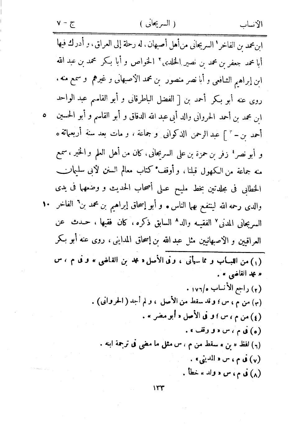 ابن محمد بن الفاخر [1] السريجانى من أهل أصبهان، له رحلة إلى العراق، وأدرك فيها أبا محمد جعفر بن محمد بن نصير الخلدى [2] الخواص وأبا بكر محمد بن عبد الله ابن إبراهيم الشافعيّ وأبا نصر منصور بن محمد الأصبهاني وغيرهم وسمع منه، روى عنه أبو بكر أحمد بن [الفضل الباطرقاني وأبو القاسم عبد الواحد ابن محمد بن أحمد الحروانى والد أبى عبد الله الدقاق وأبو القاسم وأبو الحسين أحمد بن-[3]] عبد الرحمن الذكوانيّ وجماعة، ومات بعد سنة أربعمائة وأبو نصر [4] زفر بن حمزة بن على السريجانى، كان من أهل العلم والخير، سمع منه جماعة من الكهول قبلنا، وأوقف [5] كتاب معالم السنن لأبى سليمان الخطابي في مجلدتين بخط مليح على أصحاب الحديث ووضعهما في يدي والدي رحمه الله لينتفع بهما الناس وأبو إسحاق إبراهيم بن محمد بن [6] الفاخر السريجانى المدني [7] الفقيه والد [8] السابق ذكره، كان فقيها، حدث عن العراقيين والأصبهانيين مثل عبد الله بن إسحاق المدائني، روى عنه أبو بكر