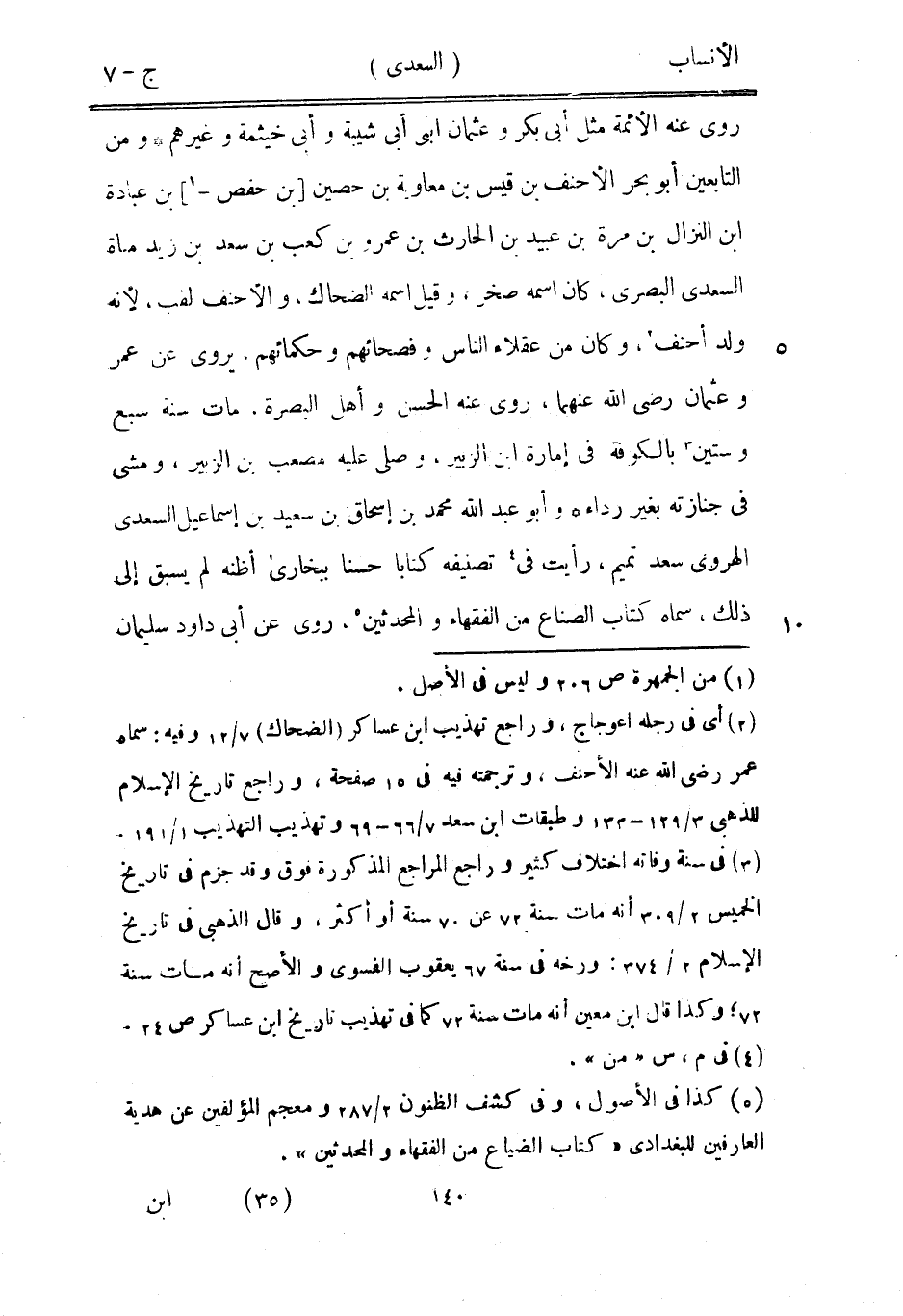 روى عنه الأئمة مثل أبى بكر وعثمان ابني أبى شيبة وأبى خيثمة وغيرهم ومن التابعين أبو بحر الأحنف بن قيس بن معاوية بن حصين [بن حفص-[1]] بن عبادة ابن النزال بن مرة بن عبيد بن الحارث بن عمرو بن كعب بن سعد بن زيد مناة السعدي البصري، كان اسمه صخر، وقيل اسمه الضحاك، والأحنف لقب، لأنه ولد أحنف [2] ، وكان من عقلاء الناس وفصحائهم وحكمائهم، يروى عن عمر وعثمان رضى الله عنهما، روى عنه الحسن وأهل البصرة، مات سنة سبع وستين [3] بالكوفة في إمارة ابن الزبير، وصلى عليه مصعب بن الزبير، ومشى في جنازته بغير رداء وأبو عبد الله محمد بن إسحاق بن سعيد بن إسماعيل السعدي الهروي سعد تميم، رأيت في [4] تصنيفه كتابا حسنا ببخارى أظنه لم يسبق إلى ذلك، سماه كتاب الصناع من الفقهاء والمحدثين [5] ، روى عن أبى داود سليمان
