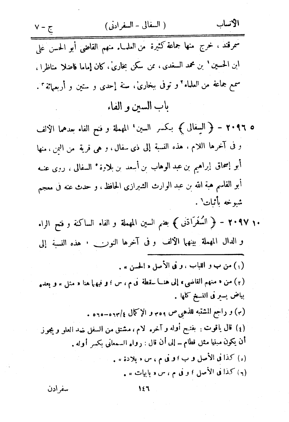 بكسر السين [4] المهملة وفتح الفاء بعدهما الألف وفي آخرها اللام، هذه النسبة إلى ذي سفال، وهي قرية من اليمن، منها أبو إسحاق إبراهيم بن عبد الوهاب بن أسعد بن بلاوة [5] السفالى، روى عنه أبو القاسم هبة الله بن عبد الوارث الشيرازي الحافظ، وحدث عنه في معجم شيوخه بإثبات [6] .
