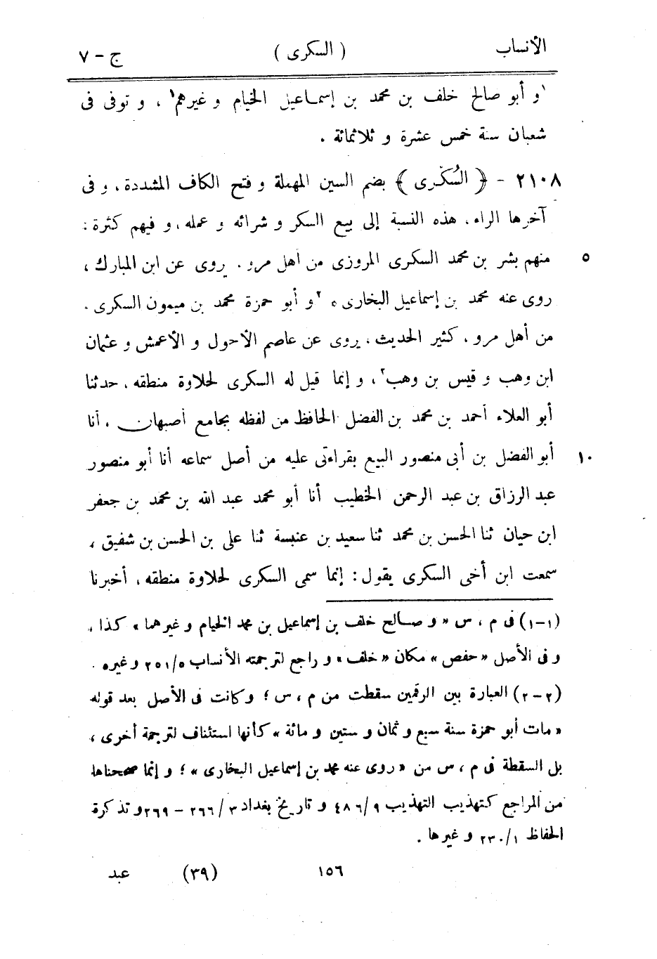 منهم بشر بن محمد السكرى المروزي من أهل مرو، يروى عن ابن المبارك، روى عنه محمد بن إسماعيل البخاري [2] وأبو حمزة محمد بن ميمون السكرى، من أهل مرو، كثير الحديث، يروى عن عاصم الأحول والأعمش وعثمان ابن وهب وقيس بن وهب [2] ، وإنما قيل له السكرى لحلاوة منطقه، حدثنا أبو العلاء أحمد بن محمد بن الفضل الحافظ من لفظه بجامع أصبهان، أنا أبو الفضل بن أبى منصور البيع بقراءتي عليه من أصل سماعه أنا أبو منصور عبد الرزاق بن عبد الرحمن الخطيب أنا أبو محمد عبد الله بن محمد بن جعفر ابن حيان ثنا الحسن بن محمد ثنا سعيد بن عنبسة ثنا على بن الحسن بن شفيق، سمعت ابن أخى السكرى يقول: إنما سمى السكرى لحلاوة منطقه، أخبرنا