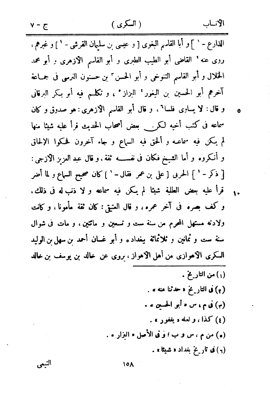 [ذكر-[1]] الحربي [على بن عمر فقال-[1]] كان صحيح السماع ولما أضر قرأ عليه بعض الطلبة شيئا لم يكن فيه سماعه ولا ذنب له في ذلك، وكف بصره في آخر عمره، وقال العتيقى: كان ثقة مأمونا، وكانت ولادته مستهل المحرم من سنة ست وتسعين ومائتين، ومات في شوال سنة ست وثمانين وثلاثمائة ببغداد وأبو غسان أحمد بن سهل بن الوليد السكرى الأهوازي من أهل الأهواز، يروى عن خالد بن يوسف بن خالد