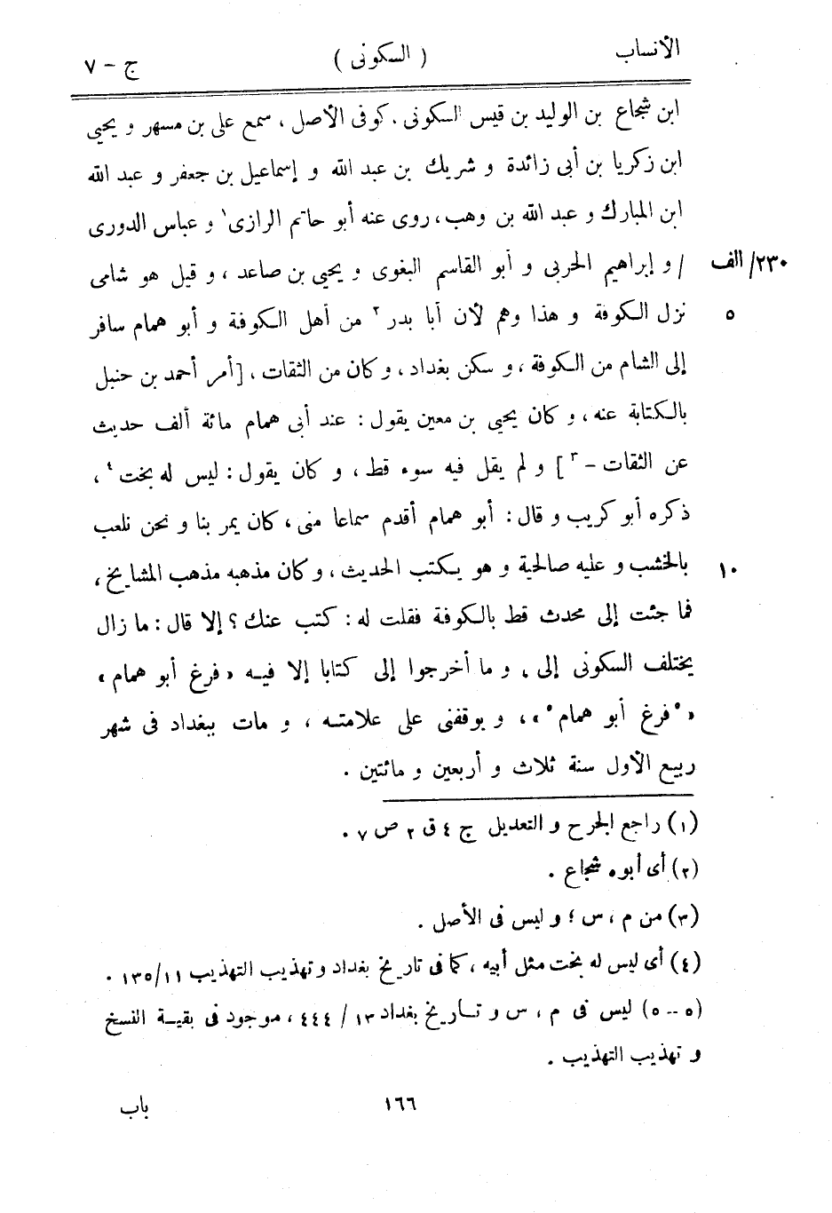ابن شجاع بن الوليد بن قيس السكونيّ، كوفى الأصل، سمع على بن مسهر ويحيى ابن زكريا بن أبى زائدة وشريك بن عبد الله وإسماعيل بن جعفر وعبد الله ابن المبارك وعبد الله بن وهب، روى عنه أبو حاتم الرازيّ [1] وعباس الدوري وإبراهيم الحربي وأبو القاسم البغوي ويحيى بن صاعد، وقيل هو شامي نزل الكوفة وهذا وهم لأن أبا بدر [2] من أهل الكوفة وأبو همام سافر إلى الشام من الكوفة، وسكن بغداد، وكان من الثقات، [أمر أحمد بن حنبل بالكتابة عنه، وكان يحيى بن معين يقول: عند أبى همام مائة ألف حديث عن الثقات-[3]] ولم يقل فيه سوء قط، وكان يقول: ليس له بخت [4] ، ذكره أبو كريب وقال: أبو همام أقدم سماعا منى، كان يمر بنا ونحن نلعب بالخشب وعليه صالحية وهو يكتب الحديث، وكان مذهبه مذهب المشايخ، فما جئت إلى محدث قط بالكوفة فقلت له: كتب عنك؟ إلا قال: ما زال يختلف السكونيّ إلى، وما أخرجوا إلى كتابا إلا فيه «فرغ أبو همام» « [5] فرغ أبو همام [5] » ، ويوقفنى على علامته، ومات ببغداد في شهر ربيع الأول سنة ثلاث وأربعين ومائتين.
